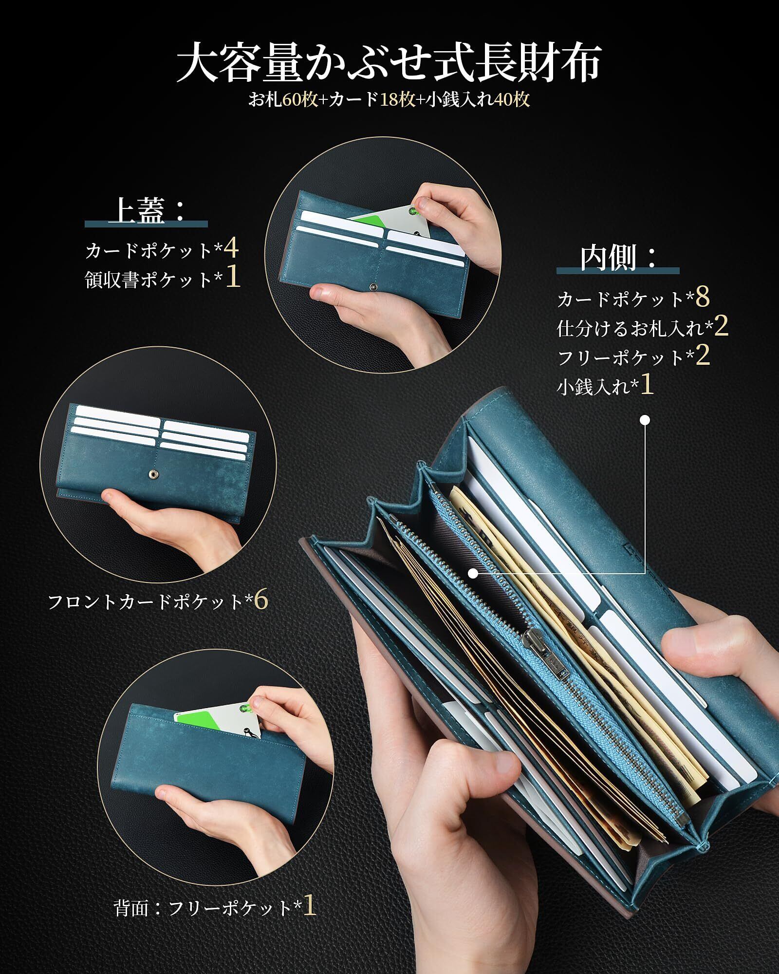 【長財布 大容量】どんなに荷物が多くても、この長財布なら安心!カードポケットは18個、仕切りのお札入れは最大60枚収納可能です。YKKファスナー付きの小銭入れには最大40枚のコインが入ります。メンズ財布のフロントには素早く取り出せるカードポケットが6つ、背面には便利なフリーポケットも完備。収納力と使い勝手が両立した一品です!