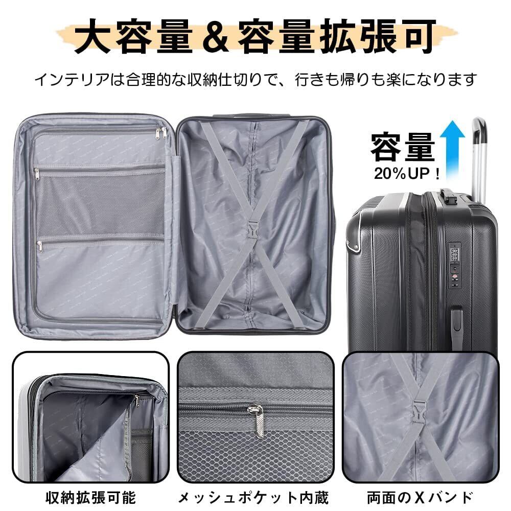 【拡張可能・大容量タイプ】 マチ幅を5cm拡張するだけで容量が20%UPできる、大容量スーツケース。土産や、冬場の衣類などで荷物が増えることも考慮して、こちらのキャリーケースを選ぶと、ゆとりが持てるのでおすすめです。さらに視認性の高いメッシュポケット内蔵、メイン収納は合計4か所で、どこに何を入れたかがひと目でわかり、取り出し作業がスムーズになります。大容量で収納便利、初心者から旅慣れた方まで幅広くご利用頂けるスーツケースです。※拡張時は機内持ち込み不可。