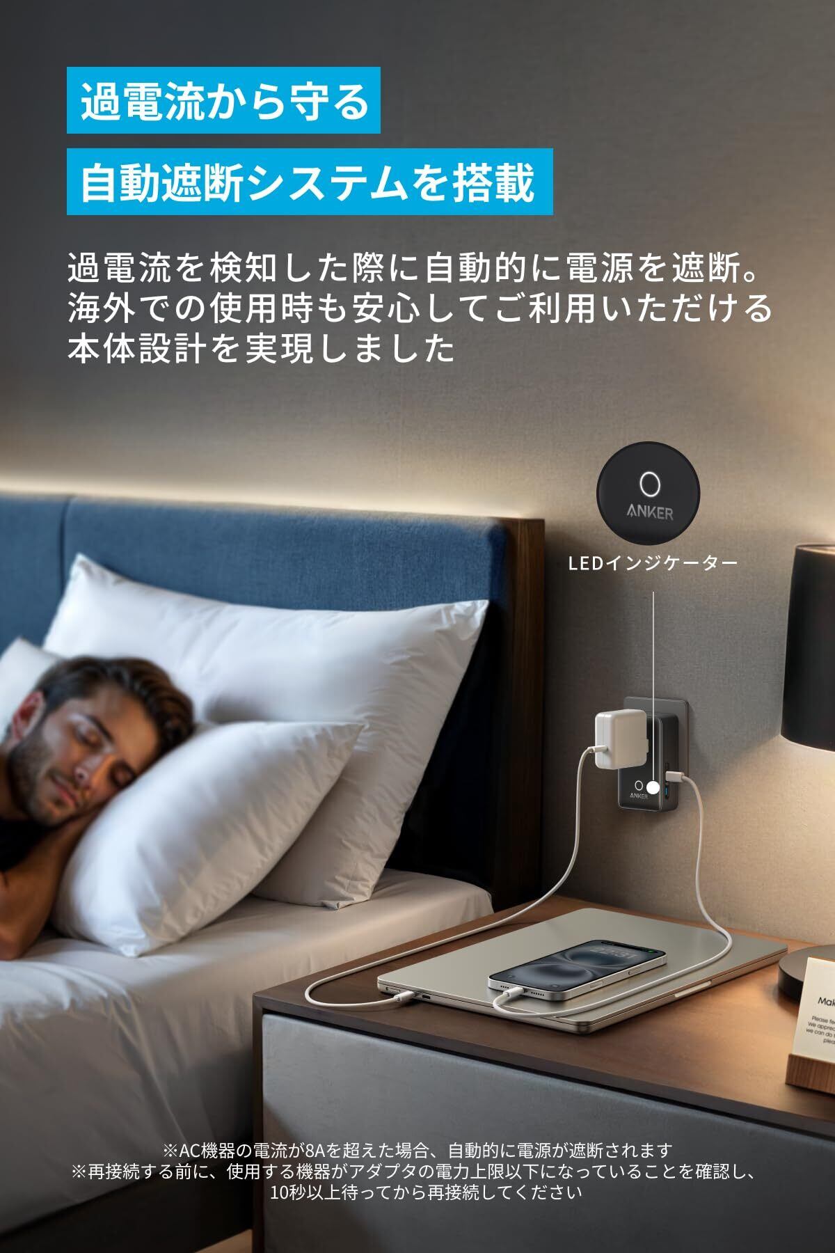 過電流から守る自動遮断システムを搭載:過電流を検知した際に自動的に電源を遮断。海外での使用時も安心してご利用いただける本体設計を実現しました。 ※AC機器の電流が8Aを超えた場合、自動的に電源が遮断されます ※再接続する前に、使用する機器がアダプタの電力上限以下になっていることを確認し、10秒以上待ってから再接続してください