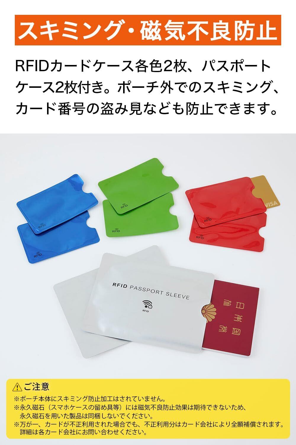 【スキミング・磁気不良防止】RFIDカードケース、パスポートケース付き。ポーチ外でのスキミングやカード番号の盗み見なども防止できます。