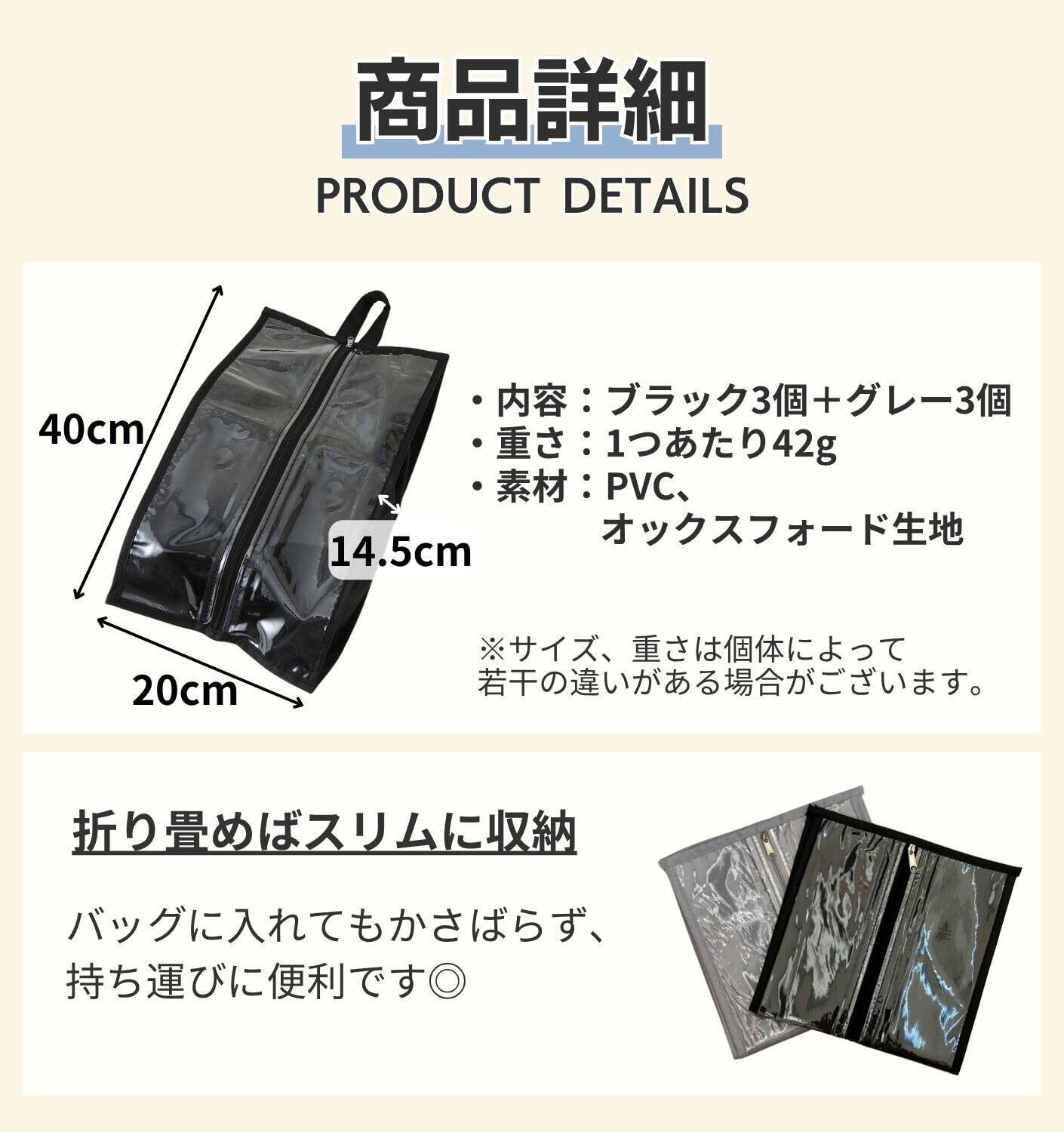 【6枚セットでお得】ブラック3枚・グレー3枚の2色セットで、シーンや用途に合わせて使い分け可能。男女問わず使いやすいカラーで、旅行時のまとめ持ちや家庭内の整理整頓にも最適です。使わないときは折りたたんでコンパクトに収納できます。