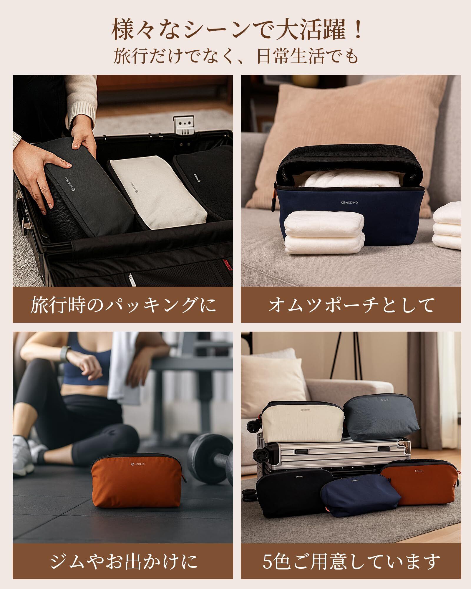 【高耐久・撥水加工素材で安心】摩耗に強い強化ポリエステル生地とナイロン糸を使用した旅行用ポーチ。撥水加工が施された丈夫な素材を使用しているため、水や汚れから大切なアイテムを守ります。洗濯可能な素材で、お手入れも簡単。清潔を保ちながら、長期間安心して使えます。