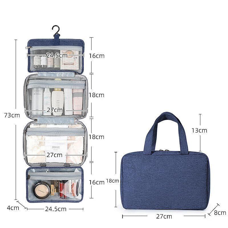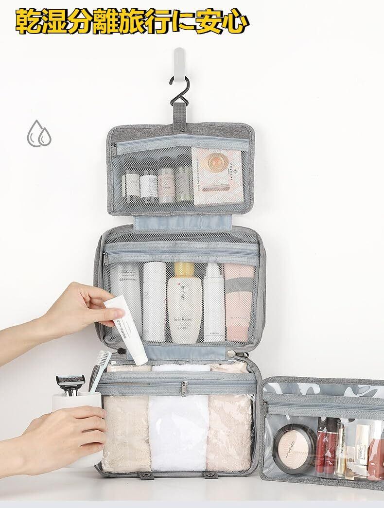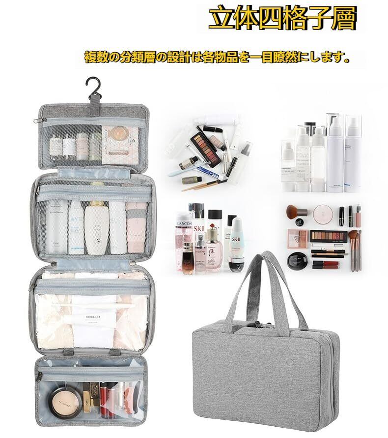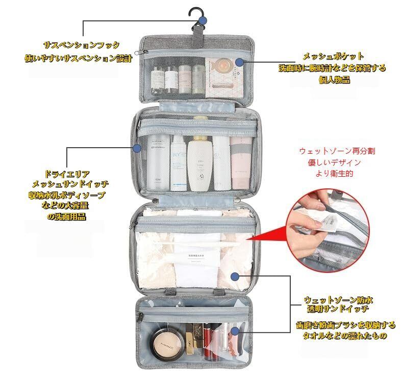 旅行や出張で宿泊先の洗面台が狭くて困ったことはありませんか?そんなときに活躍する、便利な吊り下げポーチが登場です!このポーチは 4in1 の機能を持ち、化粧品や洗面用品、歯ブラシセット、下着など、さまざまな小物をそれぞれ専用のポケットに整理整頓できます。洗面台周りが狭くても、快適に過ごせる環境を作ってくれます。