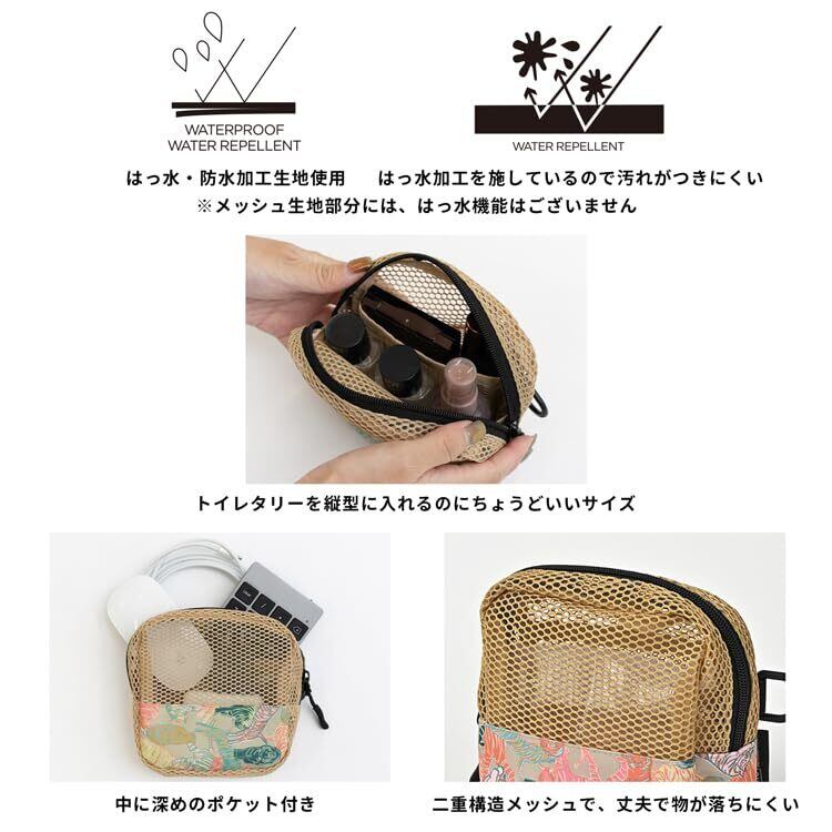 メッシュが二重構造になっており、細かいものも落ちにくく、コスメ用品や小型のトイレタリーを縦型に収納可能。