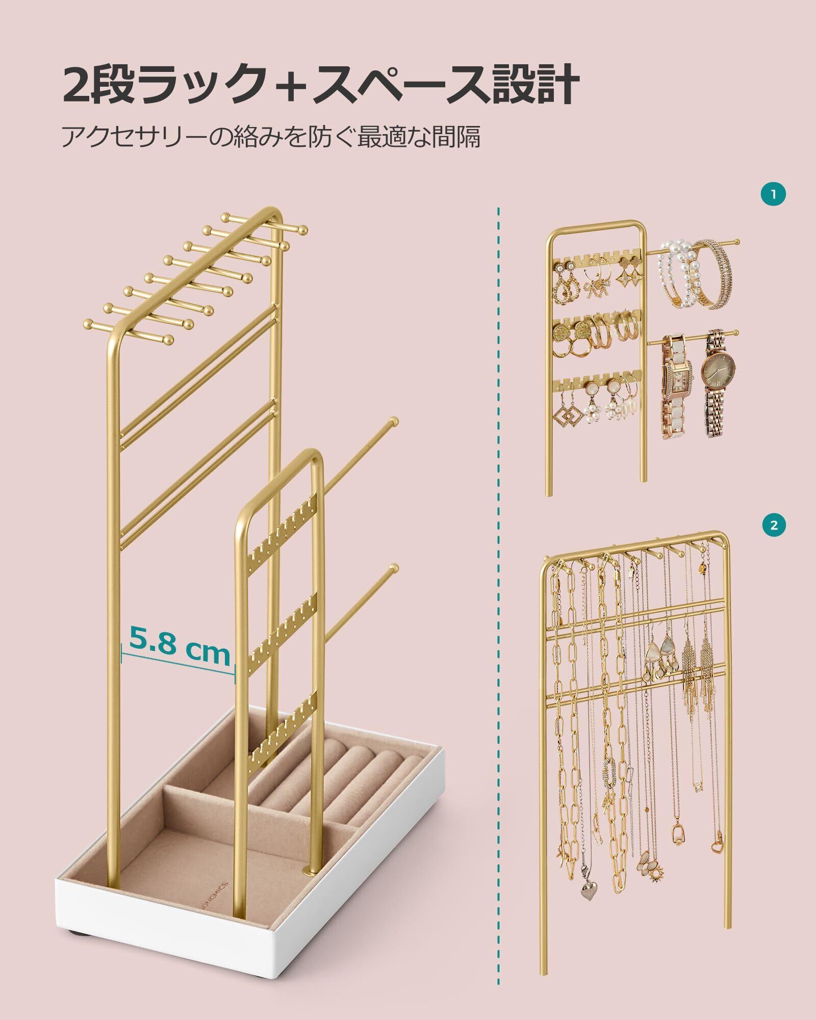 【新春セール】SONGMICS アクセサリースタンド ピアススタンド おしゃれ ジュエリー ネックレススタンド アクセサリー整理スタンド 収納 大容量 金属フレーム&ベルベットトレー付き ネックレス・ピアス・ブレスレット収納 スタッド/リング対応 ギフト 20x11.5x30.8cm 金色 JJS021A01V1