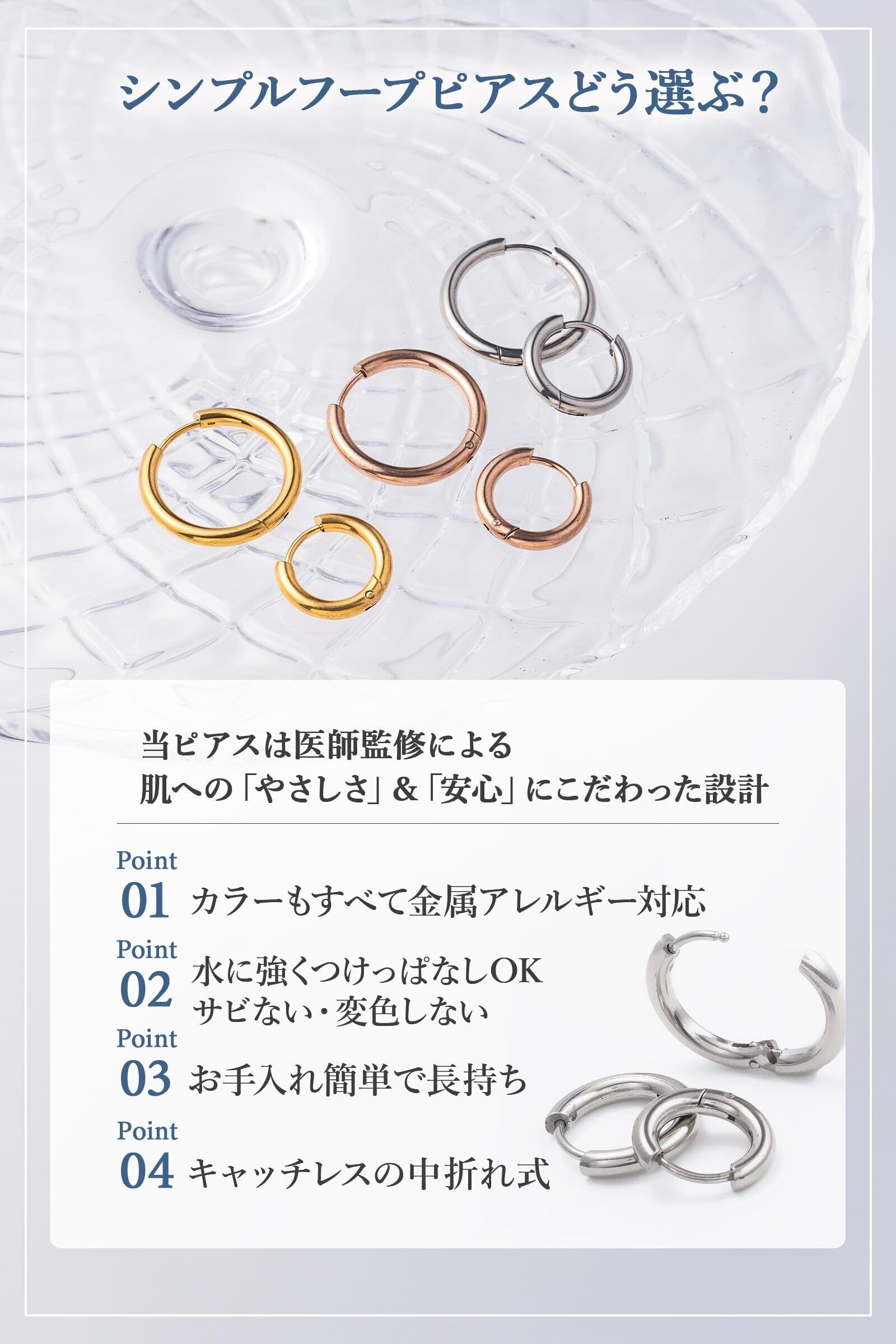 【どんなシーンにも合うシンプルなフープピアス】 ピアス初心者さんからおしゃれ上級者まで、誰でも使いやすいシンプルなデザインのフープピアスは、一つ持っておくと重宝します。 カジュアルなTシャツスタイルにも、キレイめなオフィスコーデにもマッチする万能ピアス。サイズ違いで揃えれば、重ね付けや気分に合わせたコーディネートも楽しめます。 キャッチレスな中折れ式のピアスなのでキャッチを失くす心配もなくストレスなく長時間つけっぱなしで着用可能です。