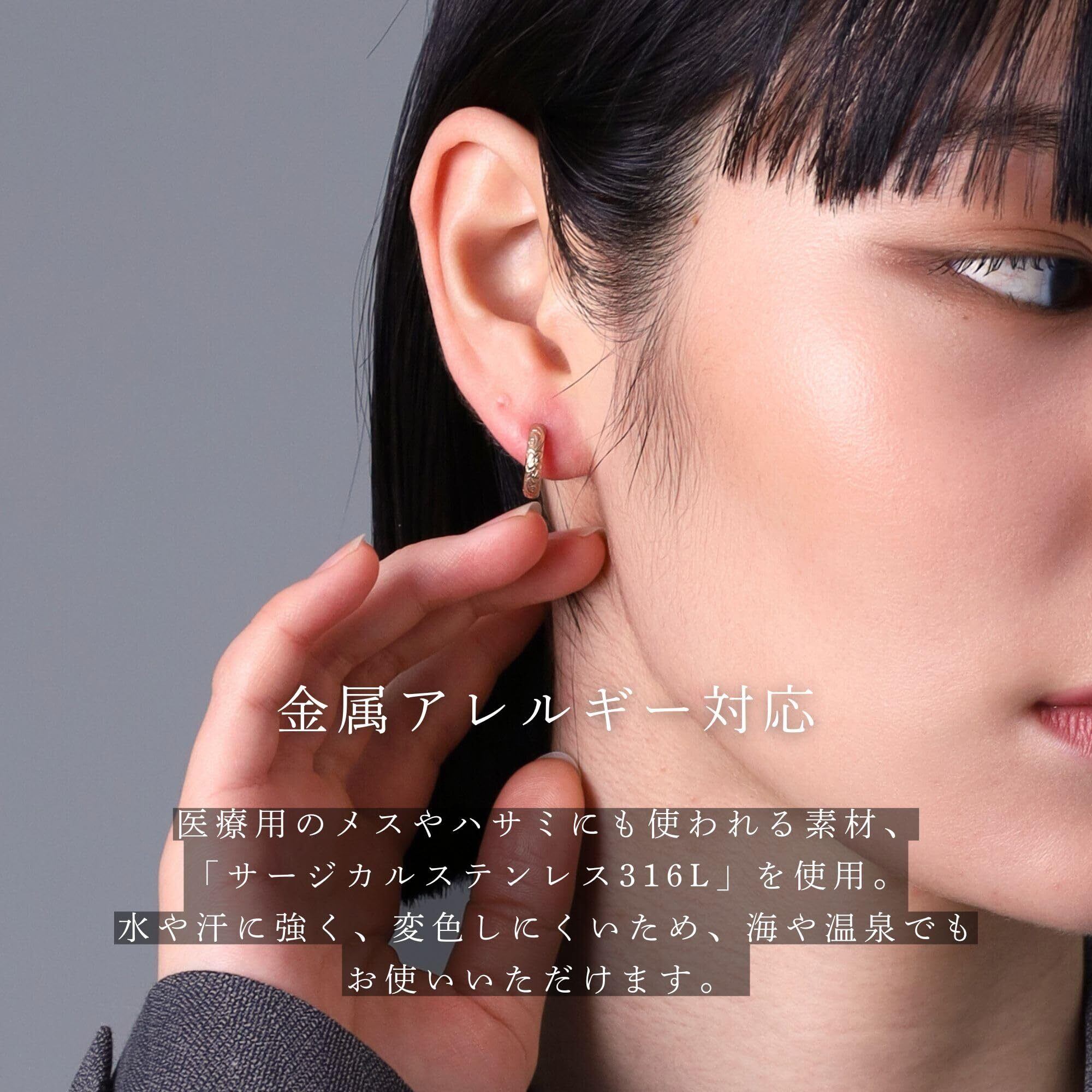 【プール/海/温泉でもつけっぱなしOK】サージカルステンレスは錆びにくく(酸化/硫化に強く)変色もしにくいので、海や温泉などのシーンで気にせず着けることができるタフな素材です。非常に硬い金属なのでピアスポストが曲がりにくく、外れにくいのも特徴です。
