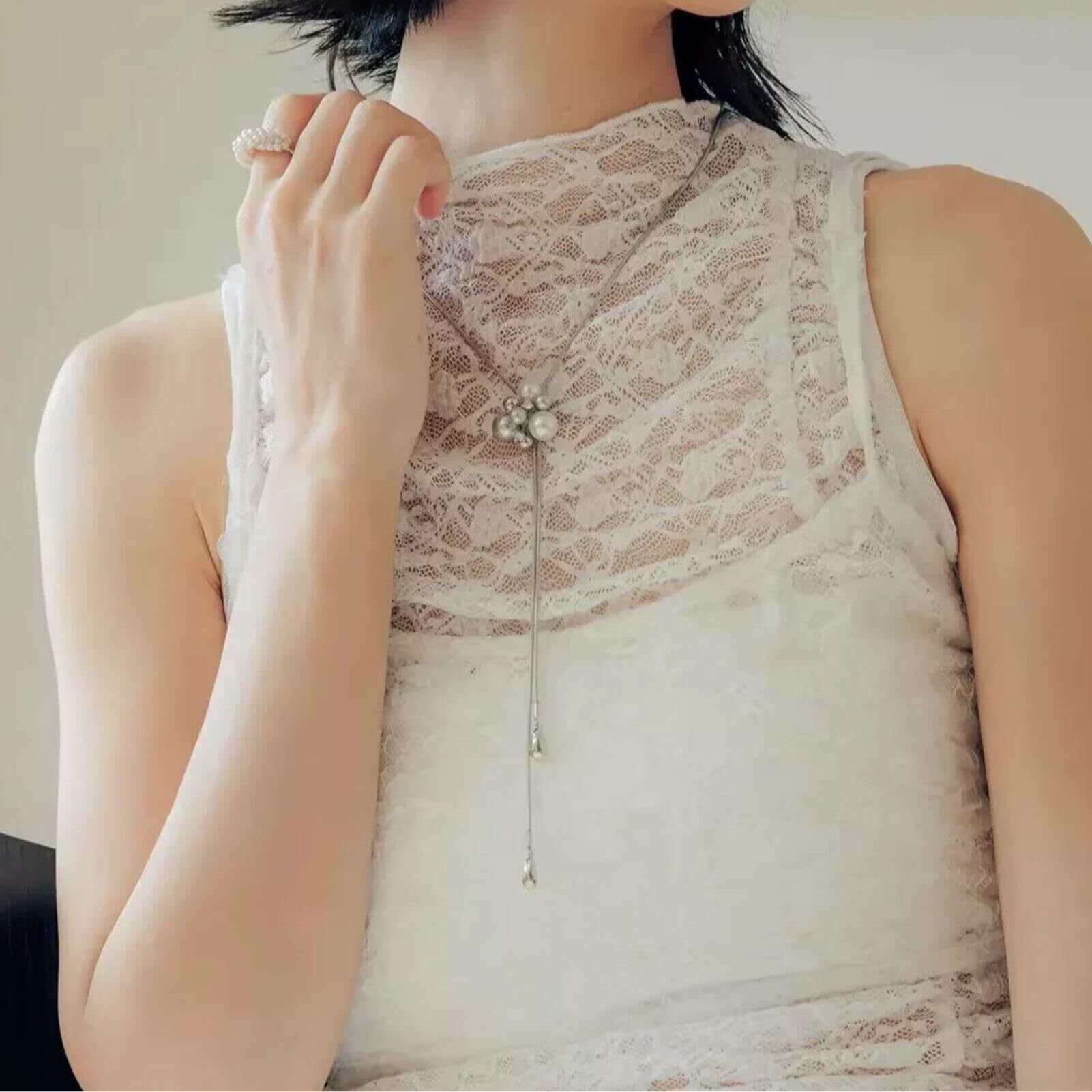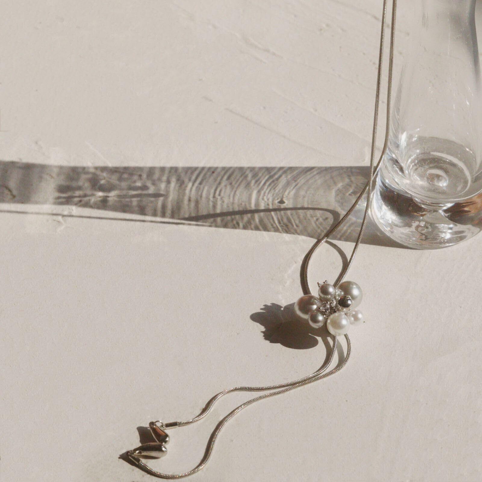 しなやかなスネークチェーンに美しいパールモチーフを合わせたロングネックレスです。