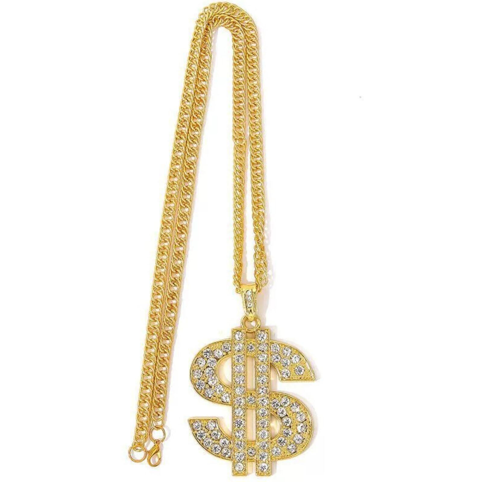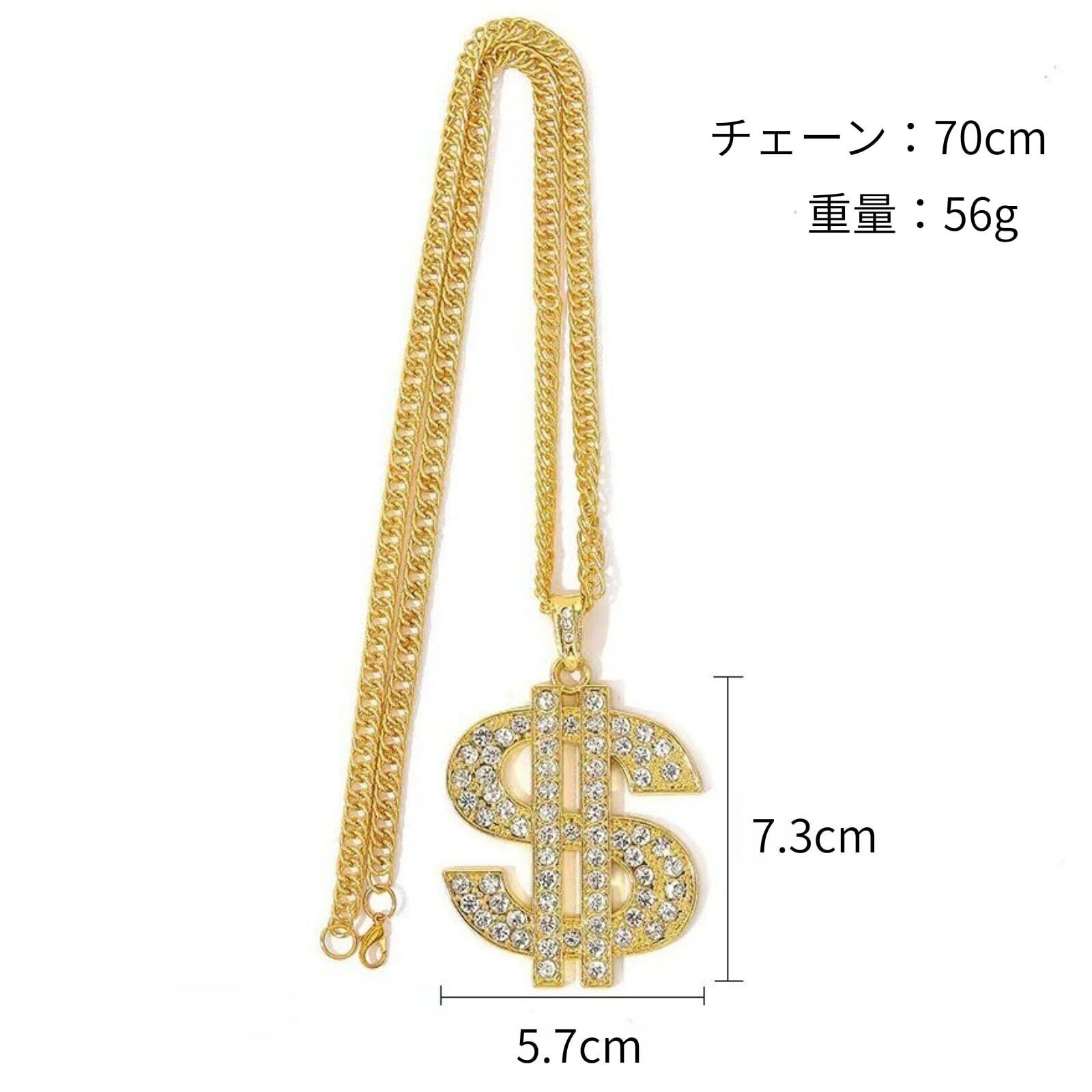 ヒップホップやパーティー、コスプレにぴったりなゴールドのドルマークネックレスです。目立つビッグサイズのペンダントに、ラインストーンを贅沢にあしらいブリンブリンな輝きを演出。70cmのキューバンリンクチェーンで、メンズ・レディース問わず着用可能です。MV撮影やステージ衣装、ハロウィンなど特別なシーンにおすすめのアクセサリーです。
