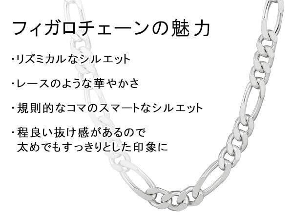 【フィガロチェーン】大小交互にコマを繋いだデザインがリズミカルな光を放ち、さりげなくも上品なおしゃれを演出してくれるフィガロチェーン。大きなコマが程良い抜け感を出し、軽やかさと爽やかさを持たせます。抜け感があるので太めでもすっきりとした印象に。スマートなシルエットと華やかさを持ったデザインはレースのようなこだわりが感じられ、女性におすすめしたいチェーンです。