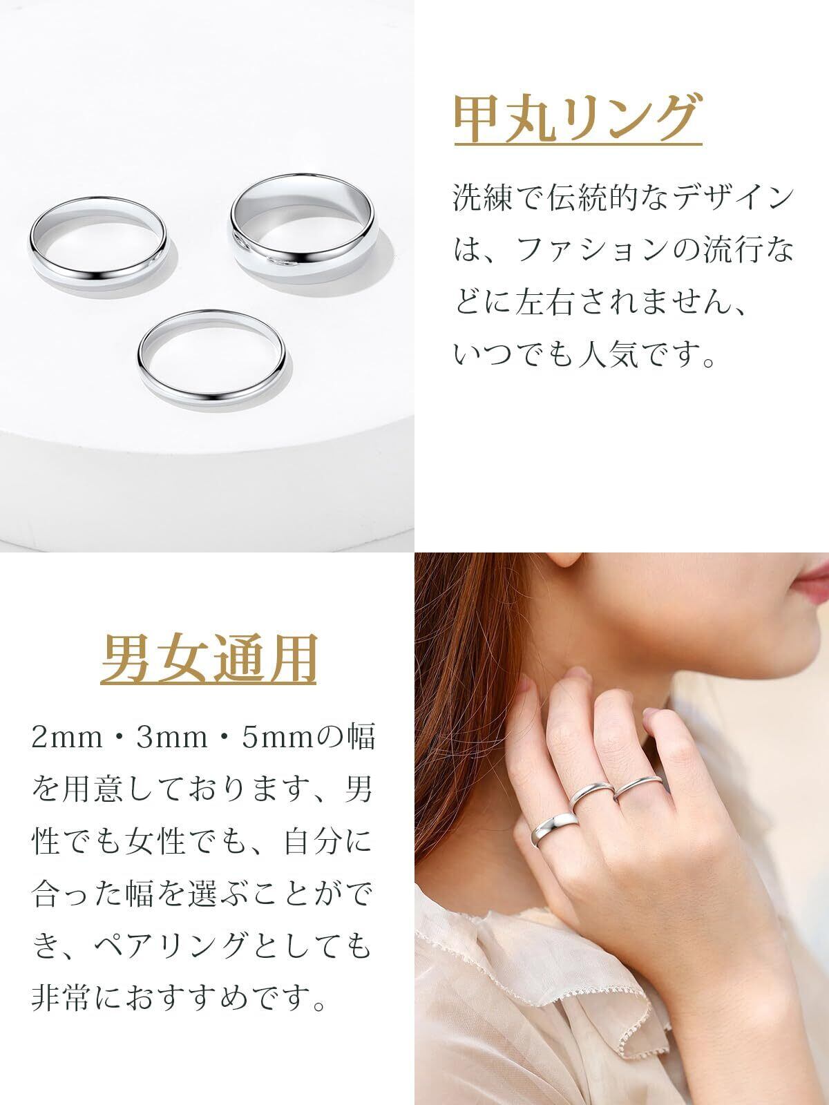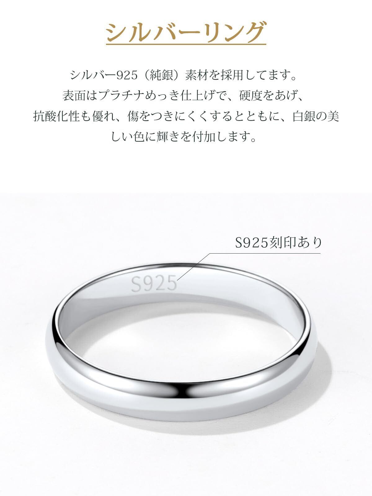 ❷素材:シルバー925(純銀)を採用してます。表面はプラチナめっき仕上げで、硬度をあげ、傷をつきにくくするとともに、白銀の美しい色に輝きを付加します。 リングサイズ:23 リング幅:3mm リング重量:1.6g