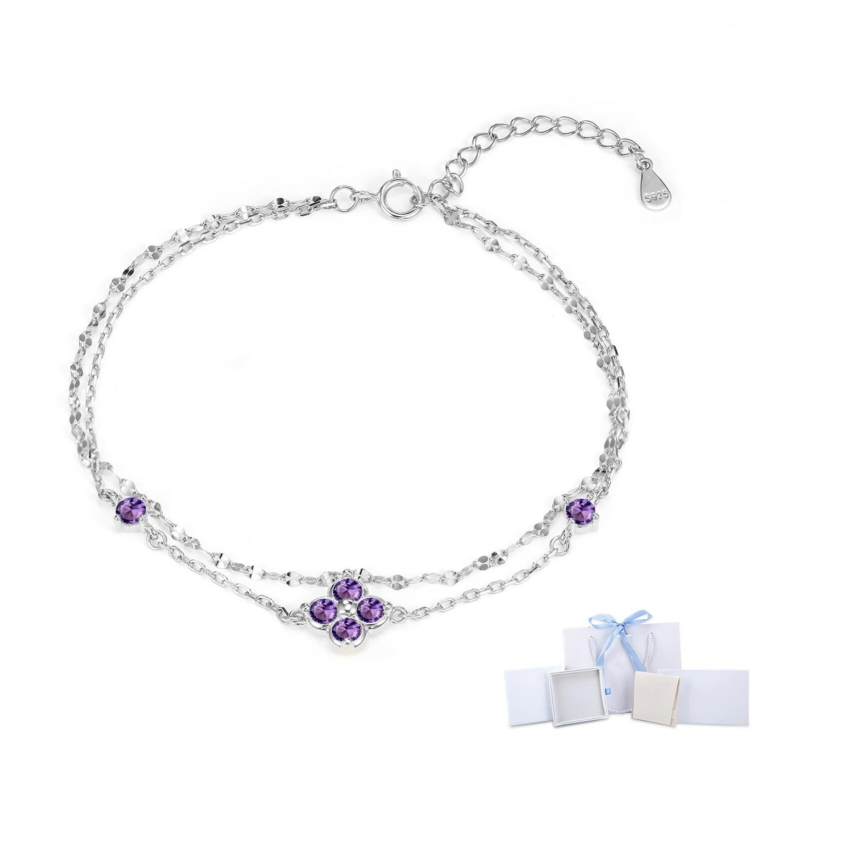 アメジスト ブレスレット レディース 2月誕生石 四つ葉のクローバー 【幸運の花】 リボン包装 シルバー 925 金属アレルギー対応 2連 ブレスレット シンプル 誕生日プレゼント女性 彼女 バレンタイン ギフト ホワイトデー お返し 入学式 卒業式
