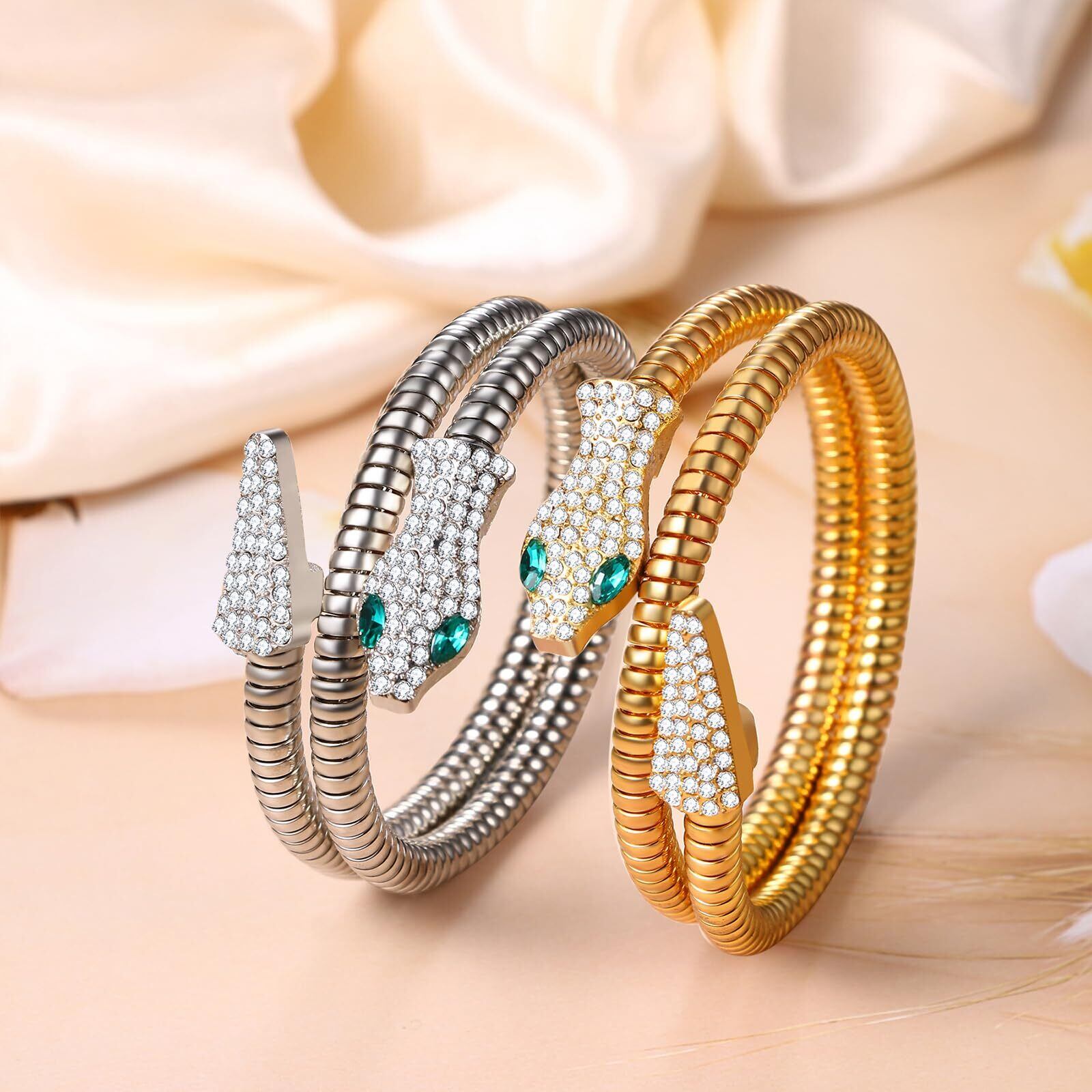 【在庫セール】蛇 バングル レディース ブレスレット ステンレス: 絡まる 多層 スネーク 腕輪 エメラルド 誕生石 蛇目 可愛い おしゃれ 腕飾り 柔らかい アクセサリー ジルコニア 女性ジュエリー シルバー