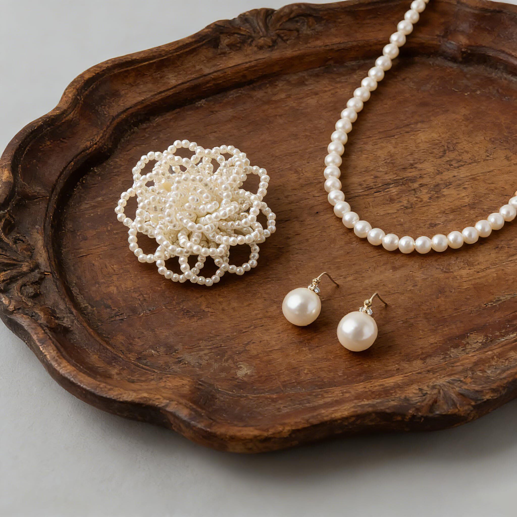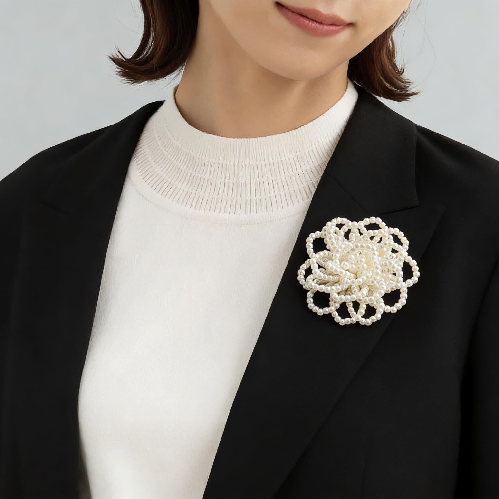 【上品に輝く人気のパールブローチデザイン】繊細な小粒パールを贅沢にあしらったフラワーモチーフ。派手すぎず、清楚で落ち着いた印象を与える人気のパールブローチです。光を優しく反射するパールの光沢が、お顔周りをパッと明るく華やかに演出します。トレンドに左右されない王道デザインで、人気の卒業式 入学式 コサージュランキングでも注目される気品あふれる逸品です。