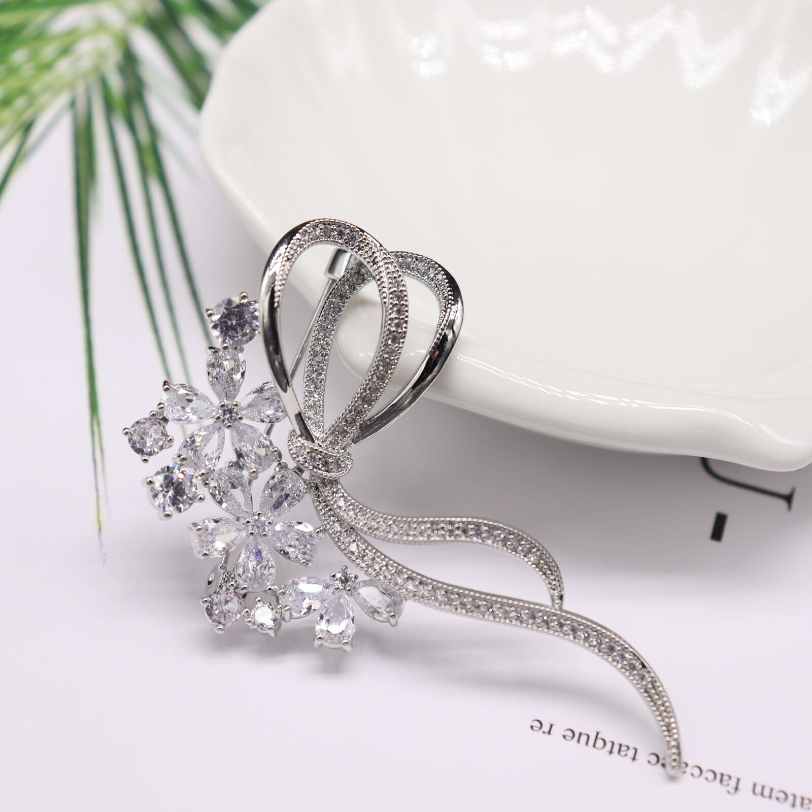 【商品仕様】色:シルバーメッキ、白ジルコン; 形: 綺麗なジルコン桜花リボンブローチ; 素材:AAA級ジルコンCZ、銅; サイズ:約6.5x4.4cm; 重さ: 約 12.3g