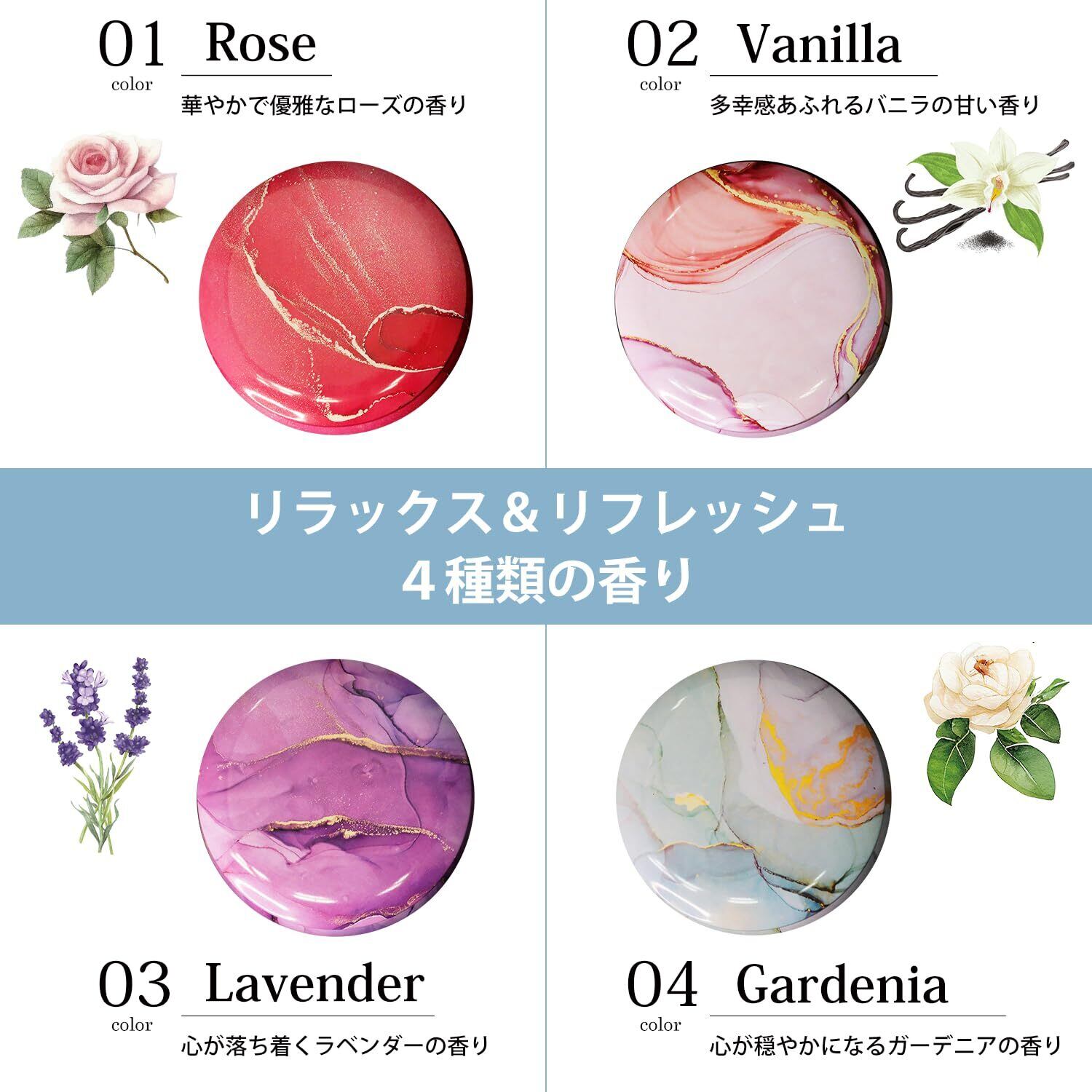 香り クチナシ, バニラ, ラベンダー, ローズ