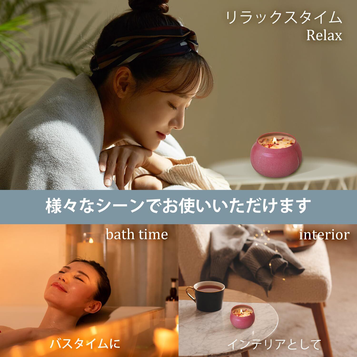 【さまざまな用途でお使いいただけます】 アロマキャンドルはさまざまな場面で活躍する製品です。リラックス、ヨガ、瞑想、入浴、アウトドア、ホームフレグランスなど。 癒しの空間作りに、インテリアにも最適。パーティーや誕生日、結婚式、バーなどのムード演出にも。