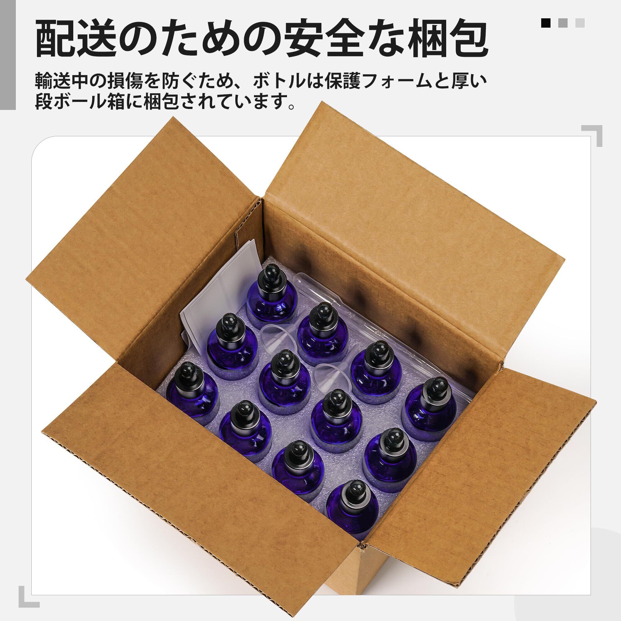 【仕様】 30ml遮光瓶ガラス(青色)x2本+ガラス製スポイトシリコントップ付きx2個+ 3mlプラスチックスポイトx 1個+プラスチック小型漏斗(じょうご)x1個 + ラベル