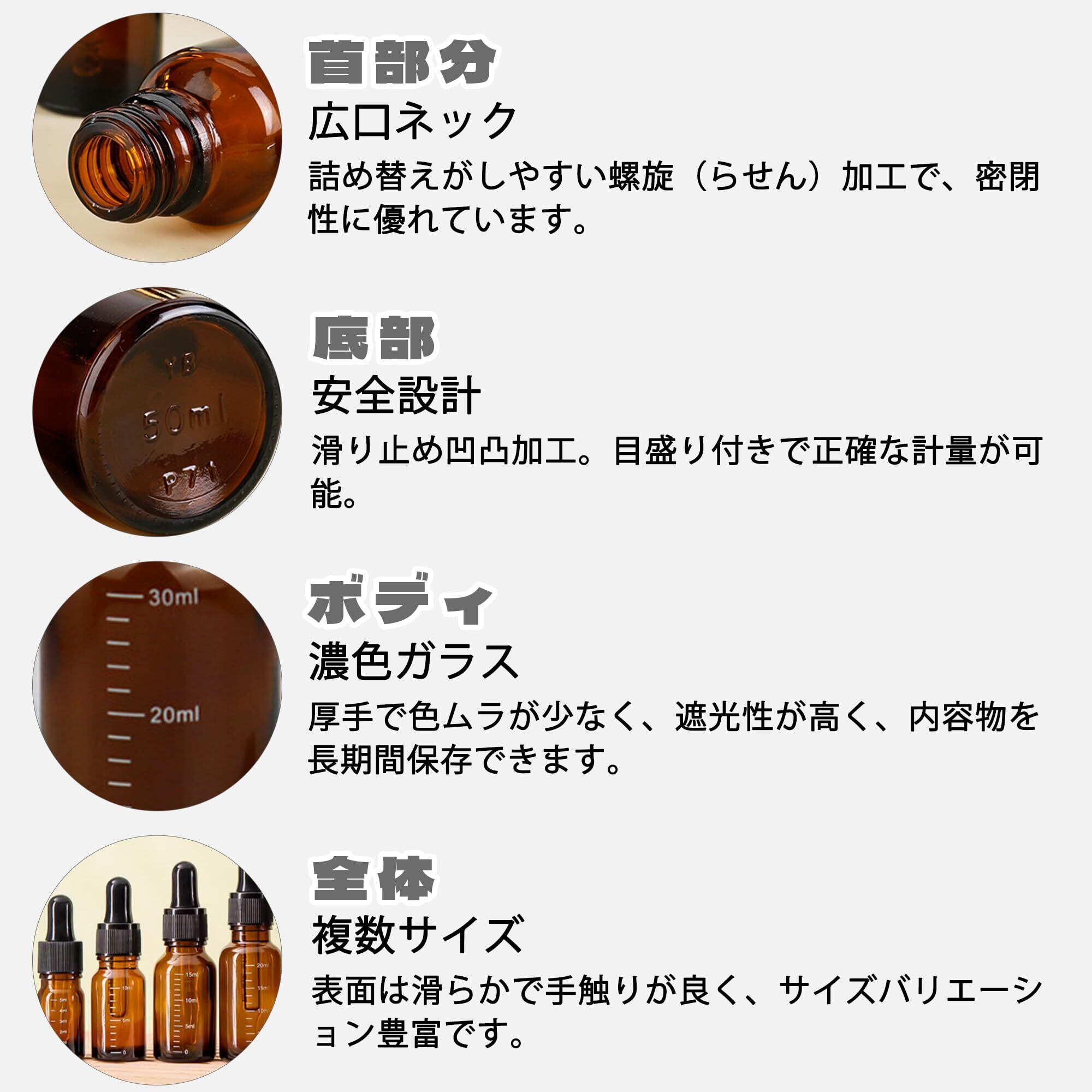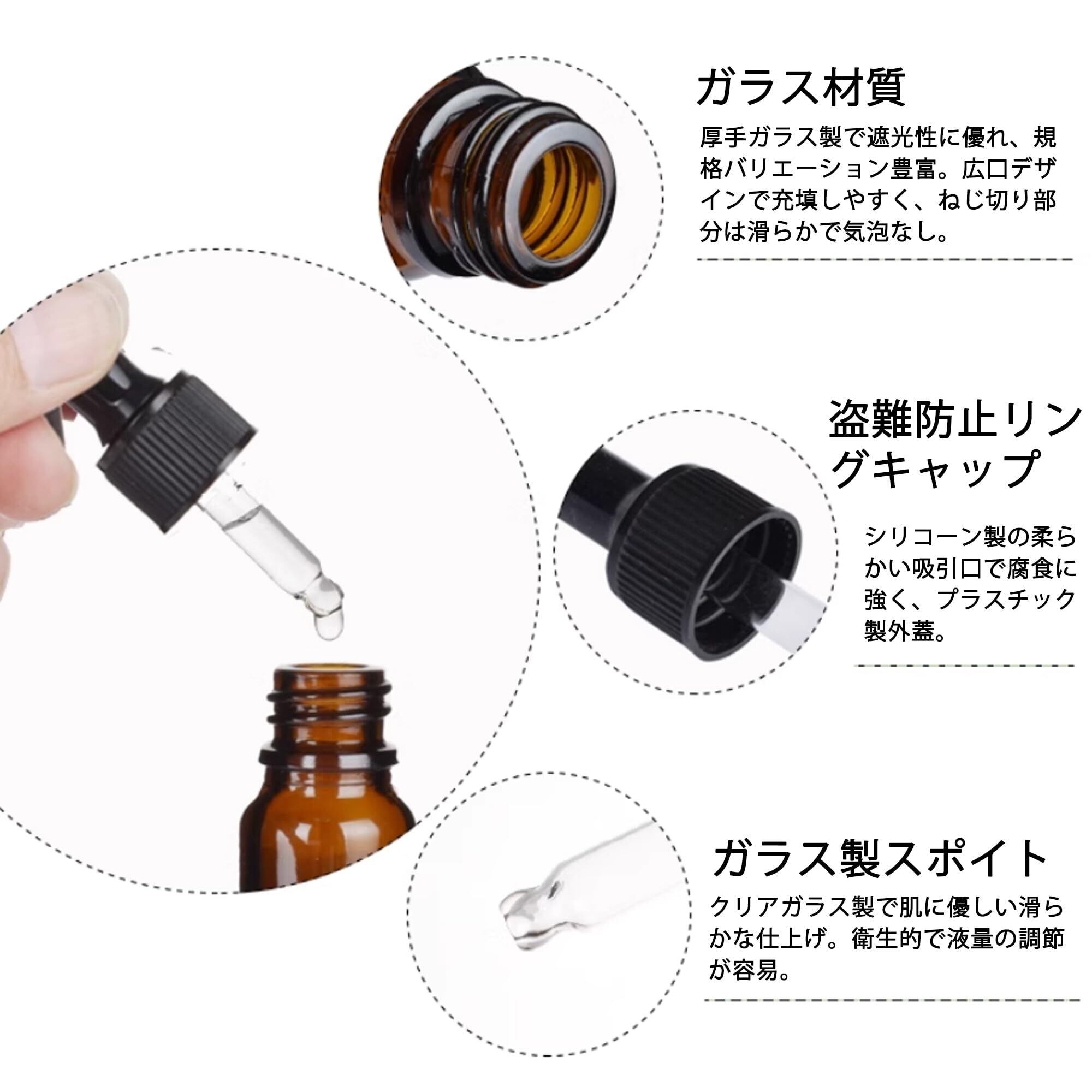 【密封設計】小分けボトルは二重螺旋キャップ+シリコン内栓で気密性が高く、揮発を防止。シリコン製スポイト付きで、液だれせず正確な量を採取可能。