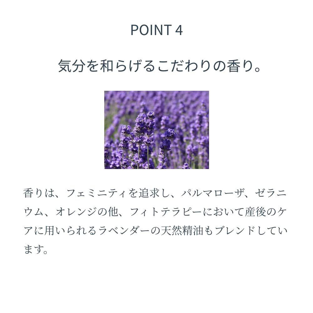 【香り】フェミニティを追求し、パルマローザ、ゼラニウム、オレンジの他、フィトテラピーにおいて産後のケアに用いられるラベンダーの天然精油もブレンド。