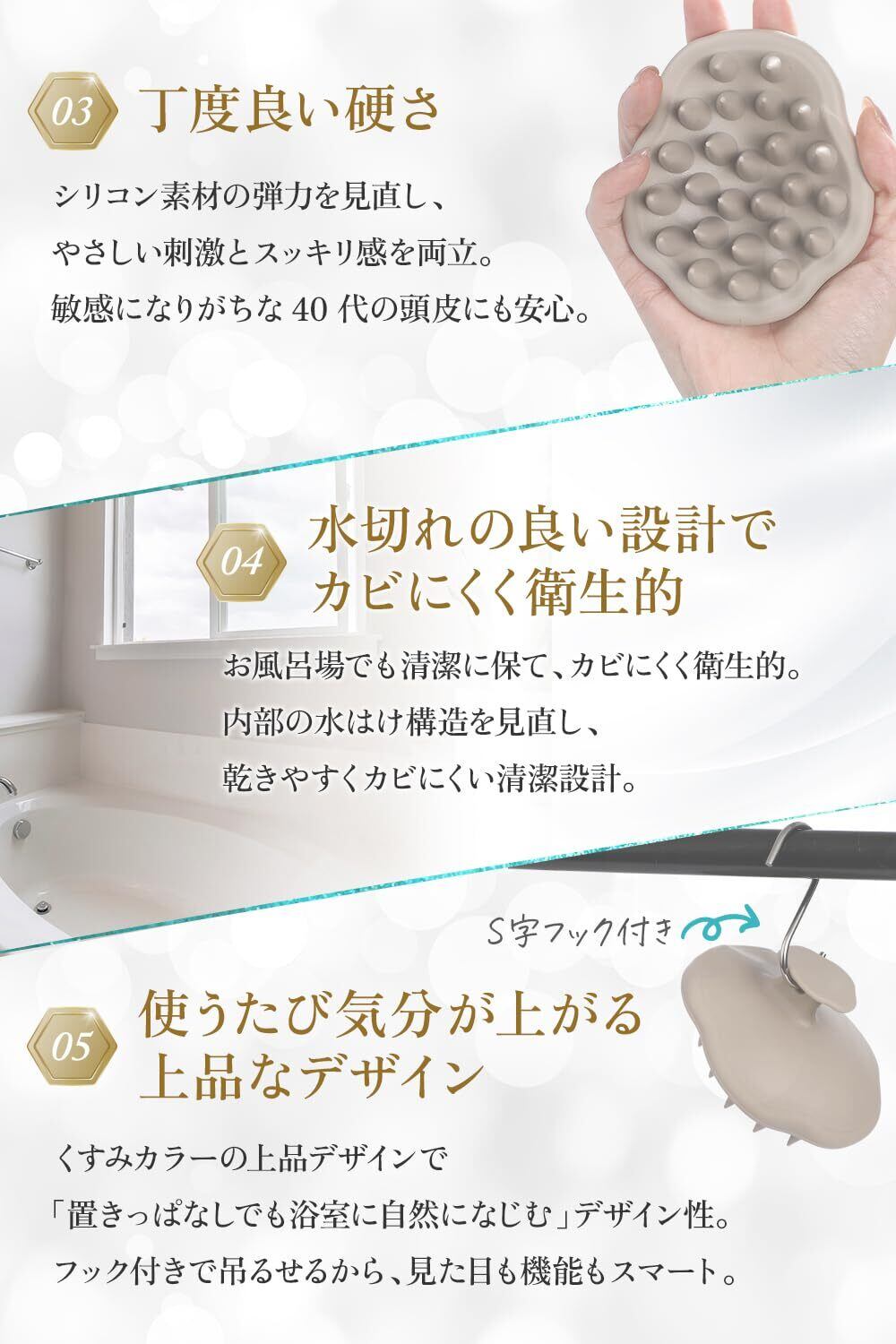 【雑誌掲載×専門家監修】 シャンプーブラシ レディース スカルプブラシ 頭皮マッサージ 頭皮ブラシ 地肌ケア くすみカラー S字フック付き