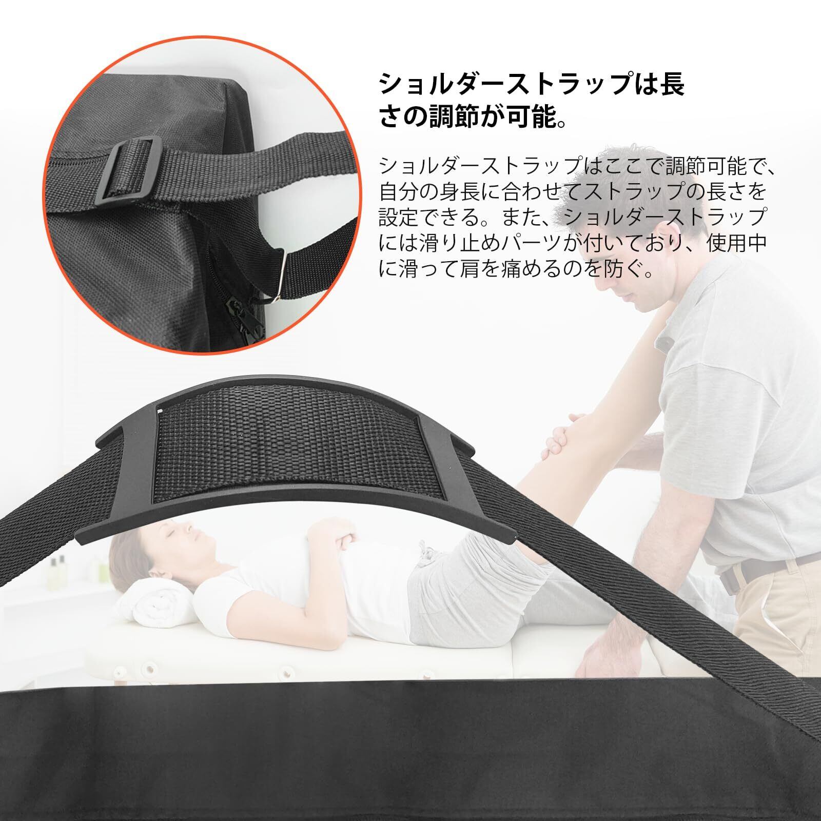 ダブルプルのショルダーストラップデザインは肩への負担を軽減し、女性でも簡単に持ち運ぶことができます。使いやすいデザインで、ショルダーストラップと手持ちの位置が肩への負担を軽減します。また、ショルダーストラップには滑り止めが付いており、使用中の滑りや肩の怪我を防ぎます。便利なジッパーデザイン、ジッパー開閉、マッサージテーブルの取り出しと収納が簡単です。