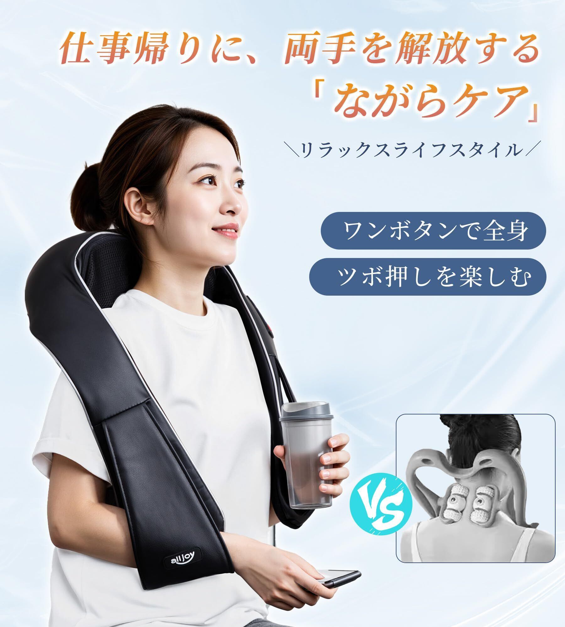 【在庫処分】ALLJOY ネックケア 3段階調整 ヒーター付き 静音設計 人気 首肩・腰・背中・太もも 正反転機能 15分オートオフ 洗えるカバー 軽量 電源コード式 車用アダプター付き ギフトにも最適