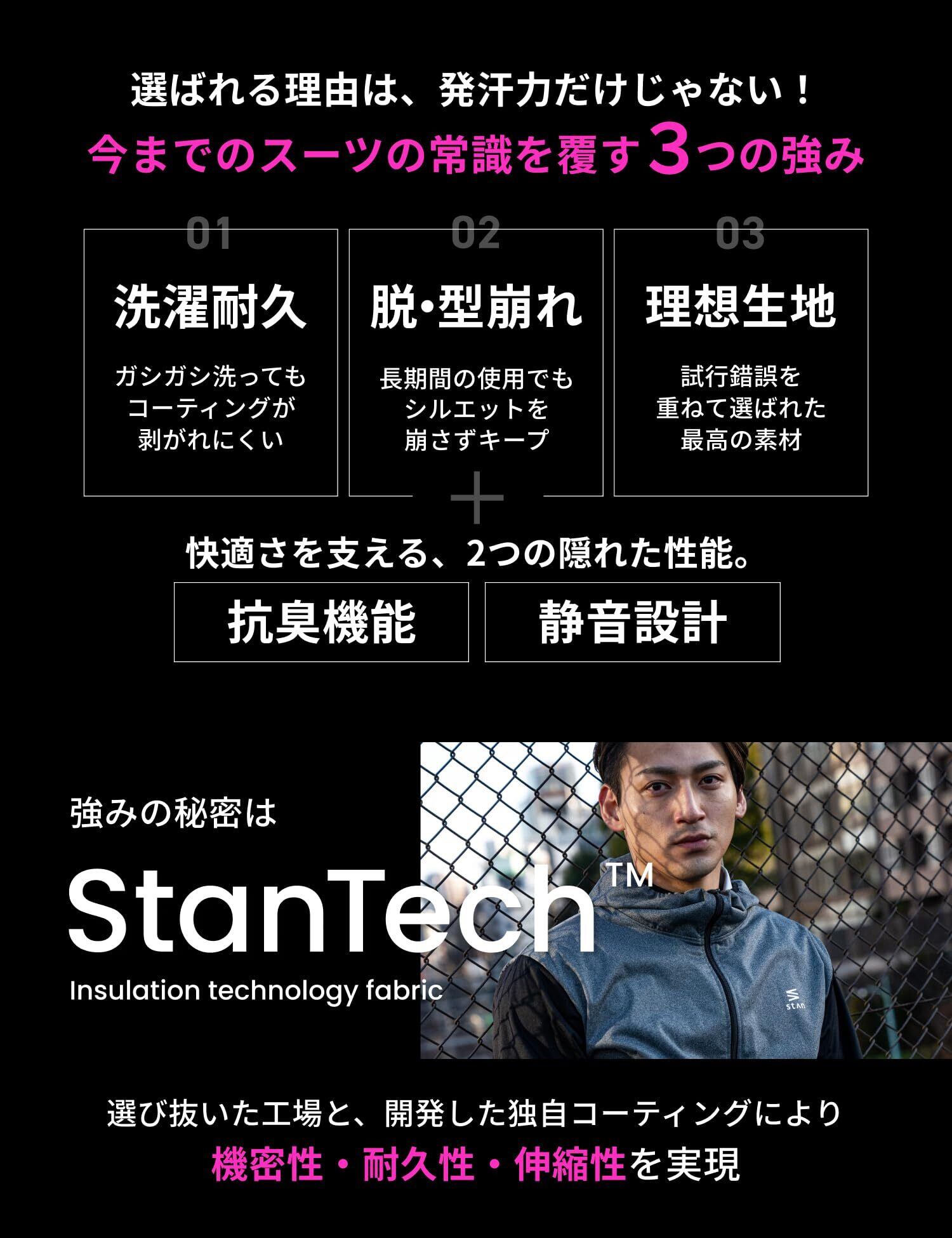 【 発売から5年!今も愛され続けているロングセラー商品 】発汗力抜群のおしゃれで高品質なstʌn(スタン)サウナスーツ。従来のサウナスーツはビニールのシャカシャカ素材やウェットスーツ素材が主流で発汗はするものの「1.ゴム臭がする」「2.生地が汗で肌に張り付き動きづらい」「3.シャカシャカ音が気になる」「4.デザイン性に乏しい」「5.手入れが面倒」などの問題があり、それらを払拭するべくstʌnサウナスーツは開発されました。