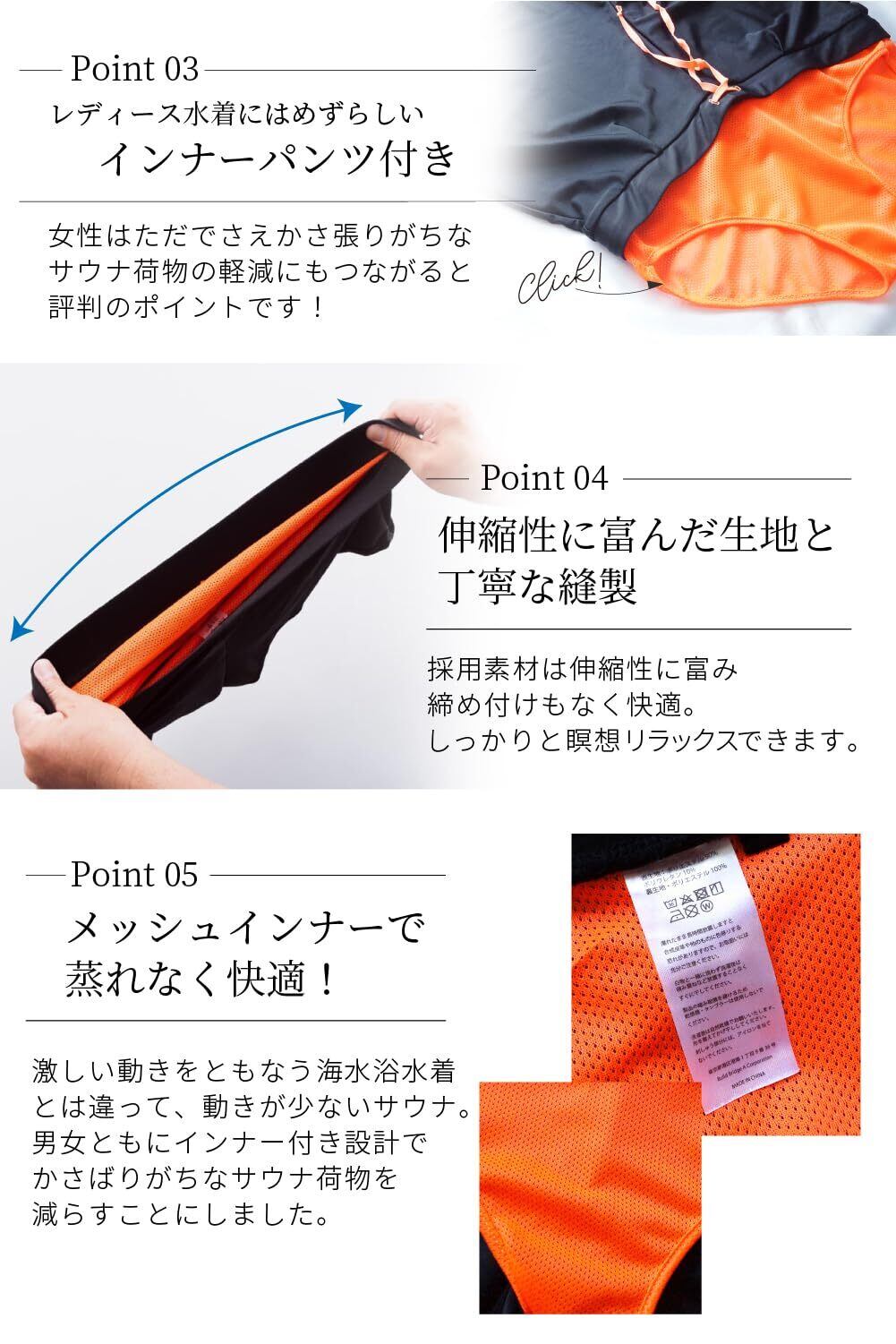 【サイズ】Mサイズ /Lサイズ 【素材】ポリエステル 100% ブラカップ付き(好みのパッドへ入れ替えも可能)男女ともにインナーパンツ付き(速乾メッシュ素材)【生産国】中国 【簡単お手入れ】家庭洗濯可能 【特徴】 ① かわいいフォルムのショートパンツスタイル(可愛くてセクシーな雰囲気を演出します)② サウナ室内での危険な金属やけどを防ぐため、金具やプラスティックパーツを一切使わない設計 ③ビビッドカラーで速乾性の高いメッシュ地のインナーパンツを装着しました ④ 通気性にも優れた高伸縮生地を採用、サウナでも動きやすく快適なデザインを実現