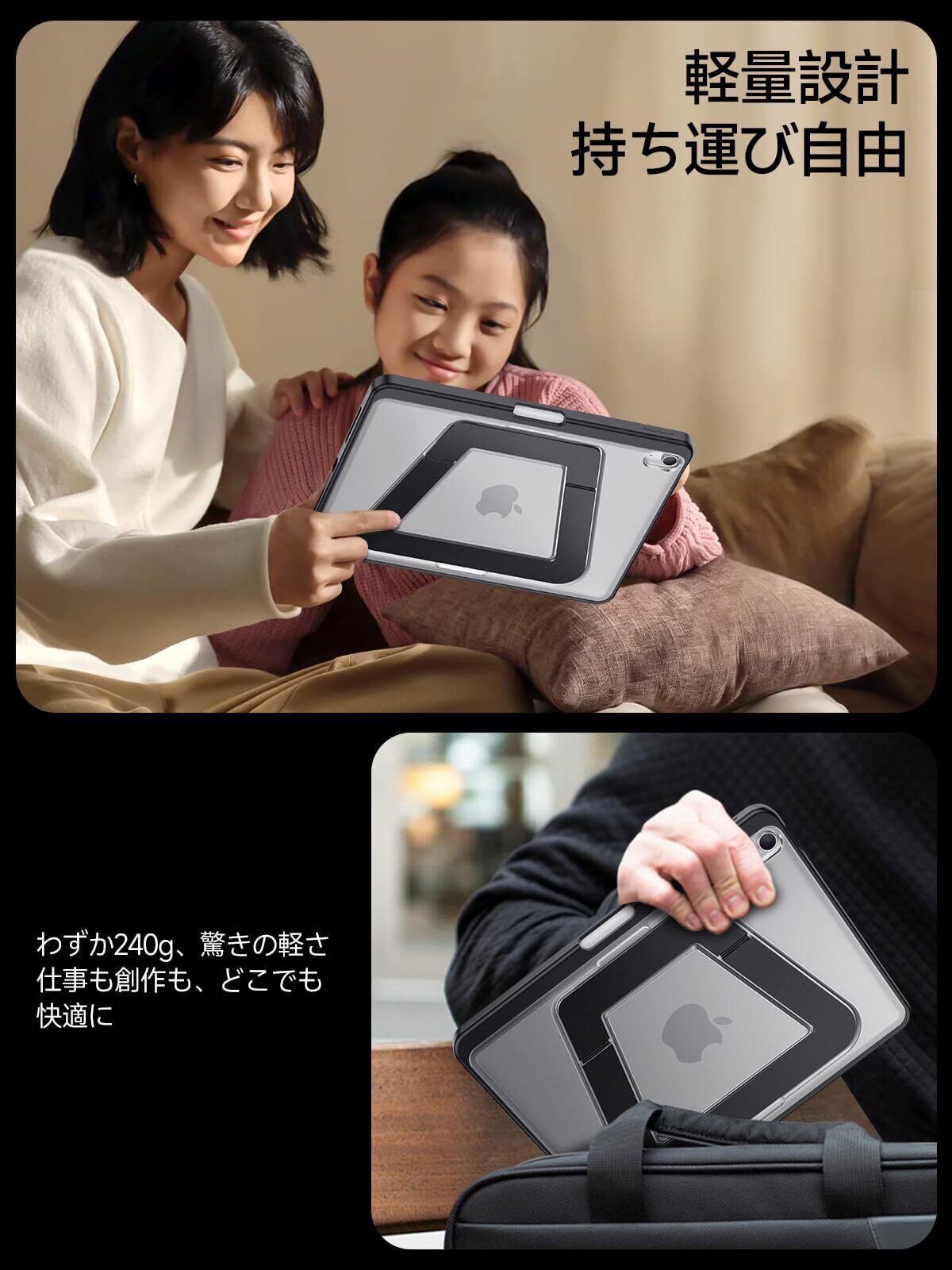 【スタイリッシュで持ち運びやすいデザイン】iPad A16用ケースの背面には、高品質な半透明マット素材を使用しており、なめらかな手触りが特長です。長く使っても色あせや剥がれが起きにくく、レザーケースのような剥がれを気にせずお使いいただけます。また、薄型でフロントカバーなしのシンプルな設計なので、スマートフォンのように軽く持ち運べて日常使いに便利です。自由で軽やかな使い心地と上品なスタイルをお楽しみいただけます。