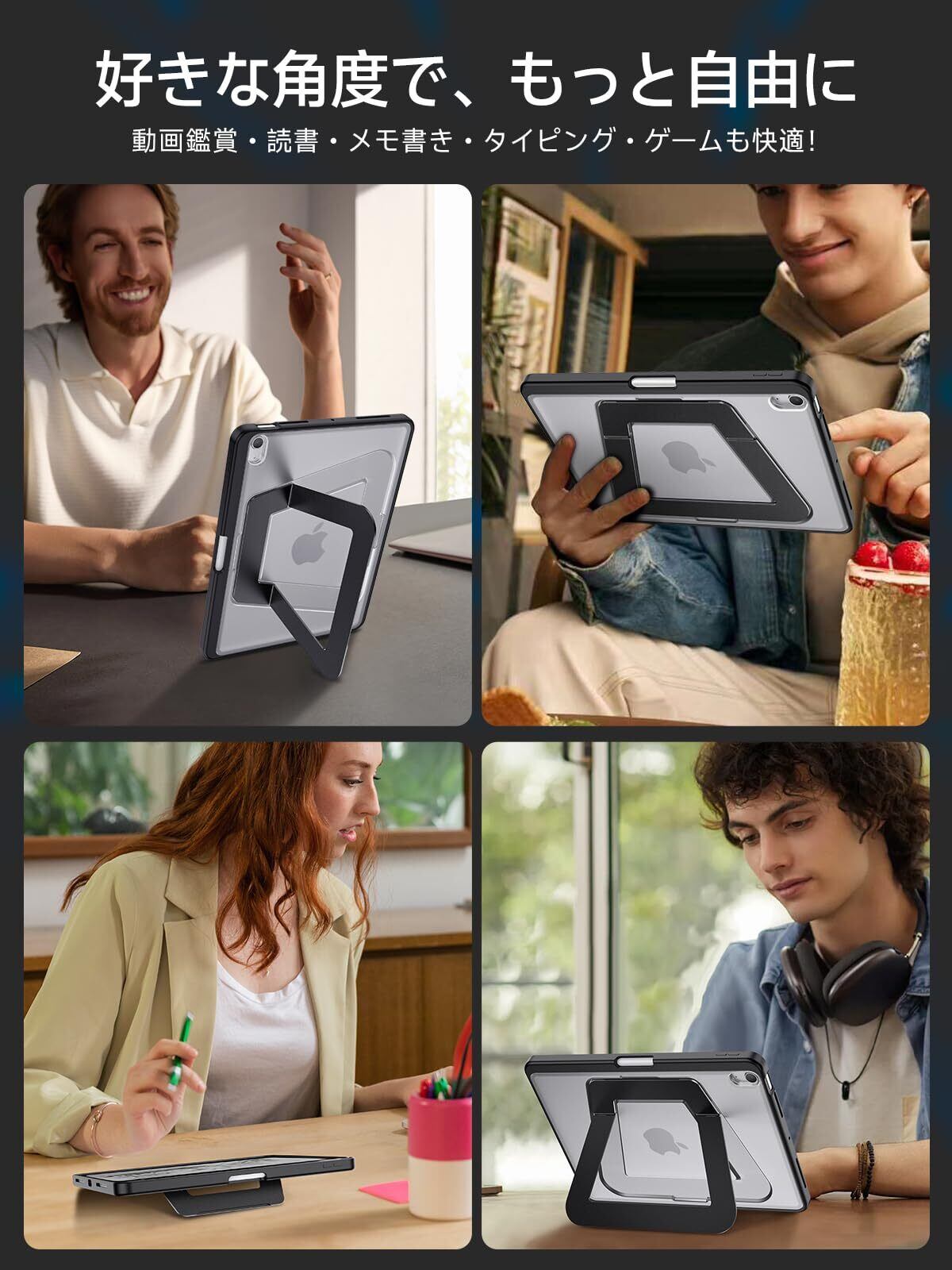 【在庫処分】【米軍MIL規格・縦置き/横置きスタンド】iPad A16 ケース 第11世代(2025)/第10世代(2022)対応 専用カバー アルミ調節式 縦横スタンド ペンシルホルダー付き 薄型 軽量 耐衝撃 半透明カバー (ブラック)