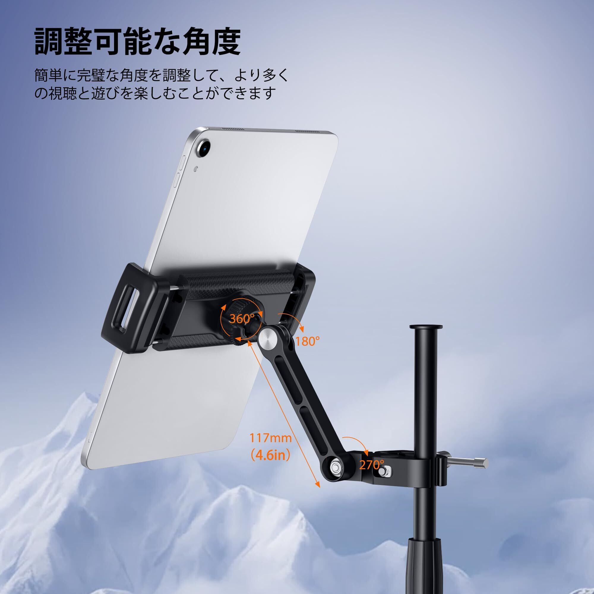 取り付けやすい:クリップを開けて、iPadホルダーをロッドに簡単に接続します。この金属製ブラケットには、直径0.63インチから1.77インチ(16 mm~45 mm)の異なる柱サイズを取り付けることができます。