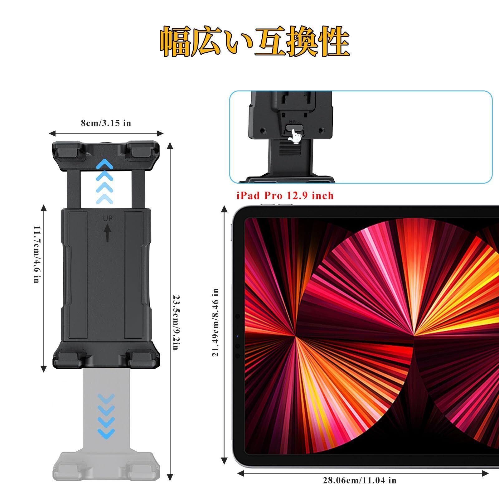 【5-13インチ全対応+1/4インチネジ穴】この車載タブレットホルダーはiPad Pro 12.9インチからスマホまで幅広く対応できます。専用クッション付きクリップで画面傷防止! さらに1/4インチネジ穴を標準装備し、カメラ三脚や照明スタンドに直接取り付け可能です。動画撮影・ライブ配信にも最適なマルチユース仕様!