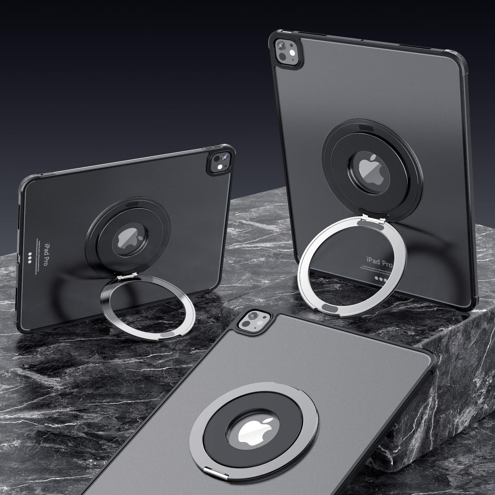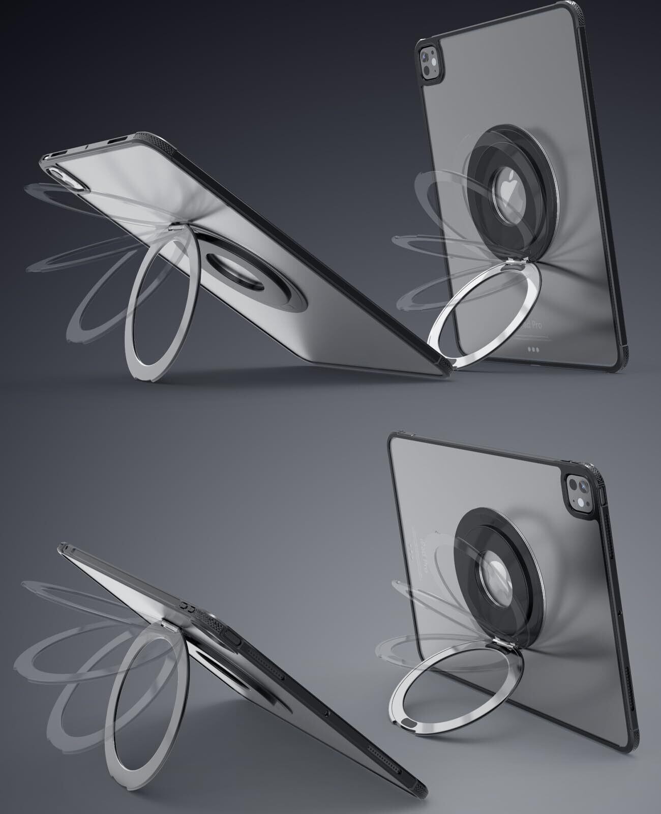 タブレットホルダー タブレットスタンド iPadスタンド【軽量&薄いリング型】卓上 横置き 縦置き 持ち運び便利 360度調整可能 マグネット設置可能 折りたたみ式 iPad Pro/Air/mini/Kindle 多機種対応 貼り付け パッド 落下防止 (ブラック)