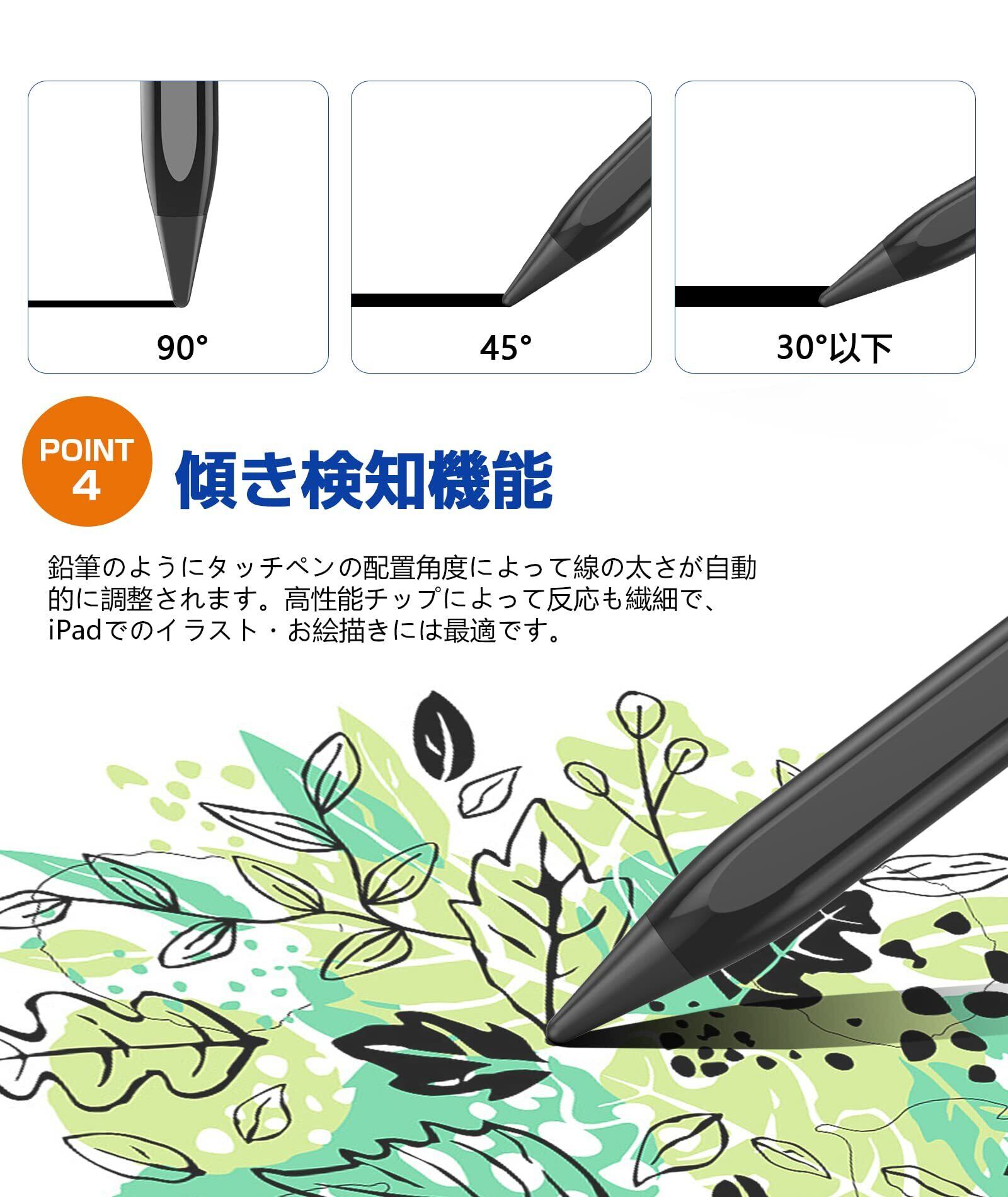 【傾き感知機能&パームリジェクション機能】:●「S10」ペンシルは傾き感知機能が搭載しています。タッチペンを傾ける角度によって線の太さを自由に調整できるので、より豊かな表現とリアルな描き心地を実現できます。●また、誤操作を防止する「パームリジェクション」機能も搭載していますので、iPadの画面に手を置いたままでも支障なく描くことができます。
