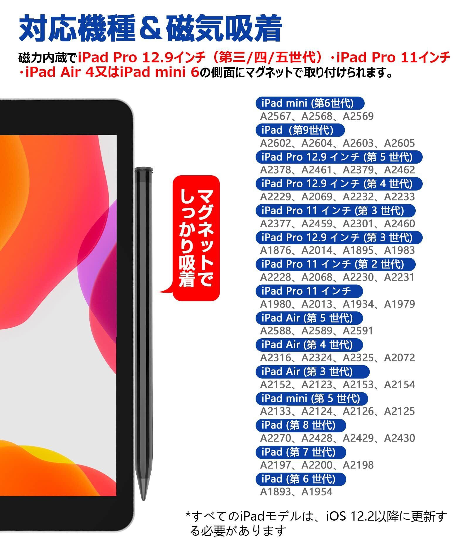 【操作簡単&マグネットでiPadに取付ける】:●Bluetoothペアリングの複雑な手続きは不要です。ヘッドの電源ボタンをダブルタップするだけで電源が入り、すぐにiPadでお絵かきが楽しめます。●便利なマグネット吸着機能により、iPad mini 6、iPad Pro 12.9インチ(第3世代、第4世代、第5世代、第6世代)、iPad Pro 11インチ、及びiPad Air(第4世代、第5世代)の側面に磁力で取り付けられるため、ペンを紛失する心配がありません。収納と持ち運びが便利です。