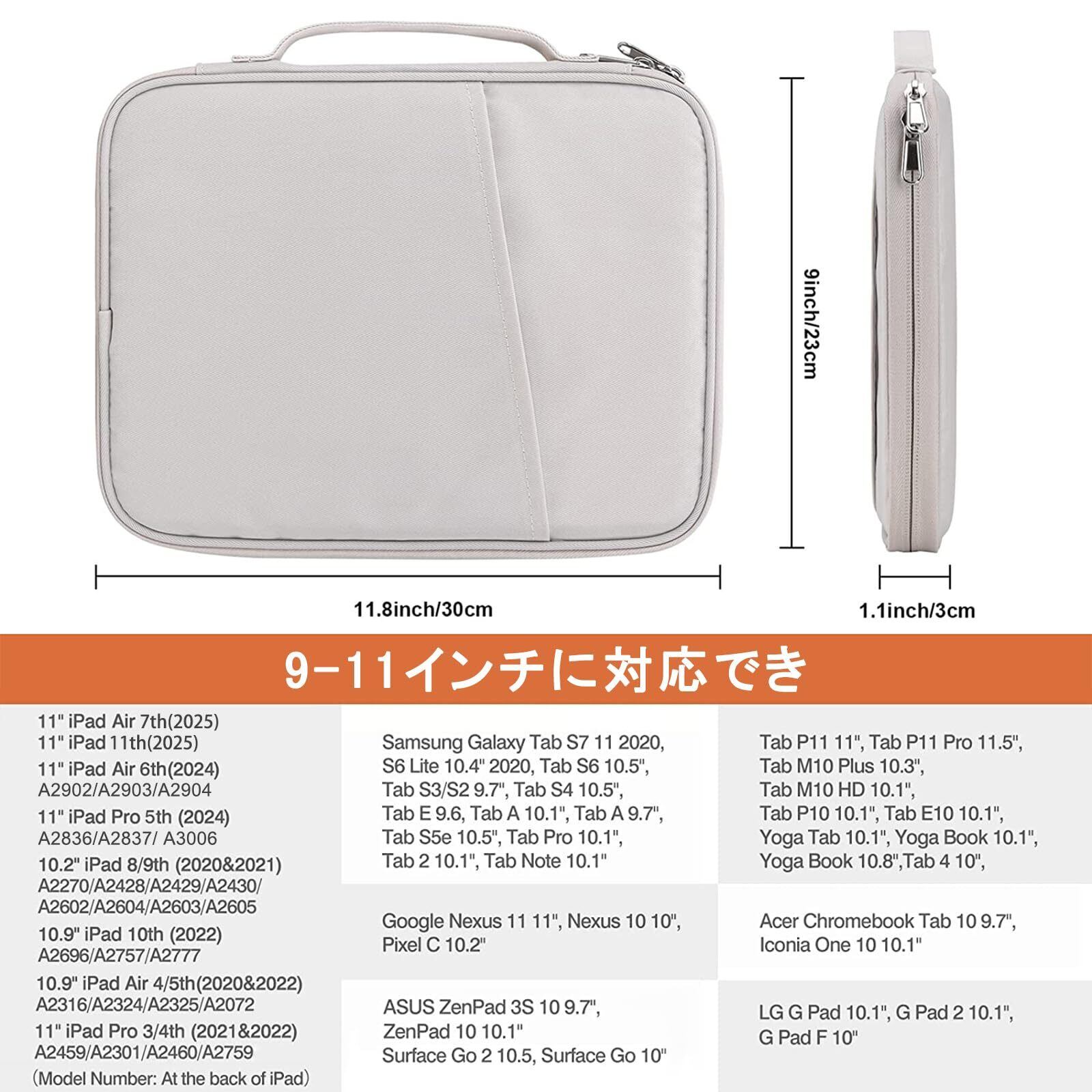 対応機種: iPadタブレットスリーブの内部寸法:28.5 x 21.5 x 2cm。外寸:30 x 23 x 3cm。11インチ iPad Pro M4/M2/M1 第4/3/2/1世代 2024-2018 | 11インチ iPad A16 | 11インチiPad Air 7世代/ 6世代 (M3 M2,2025/2024) /10.9インチ iPad Air 5世代/4世代 M1 2022-2020 | 11インチ/10.9 インチiPad 11/10世代 2025-2022 | 10.2インチiPad 9/8/7 2021-2019 |10.5/9.7インチiPad Pro(2017/2016) | 9.0インチLen-ovo Tab B9 | Galaxy Tab S9 A9 A9+ A8 A7 S8 S7 S6 | Surface Go 10インチ |11インチ Redmi Pad SE |シャオミPad 7 11.2インチ | 11インチiPlay60 Pro|Bmax I10 Plus10インチなどに対応。ご購入の際に、機種とサイズをご確認いただきようお願い致します。