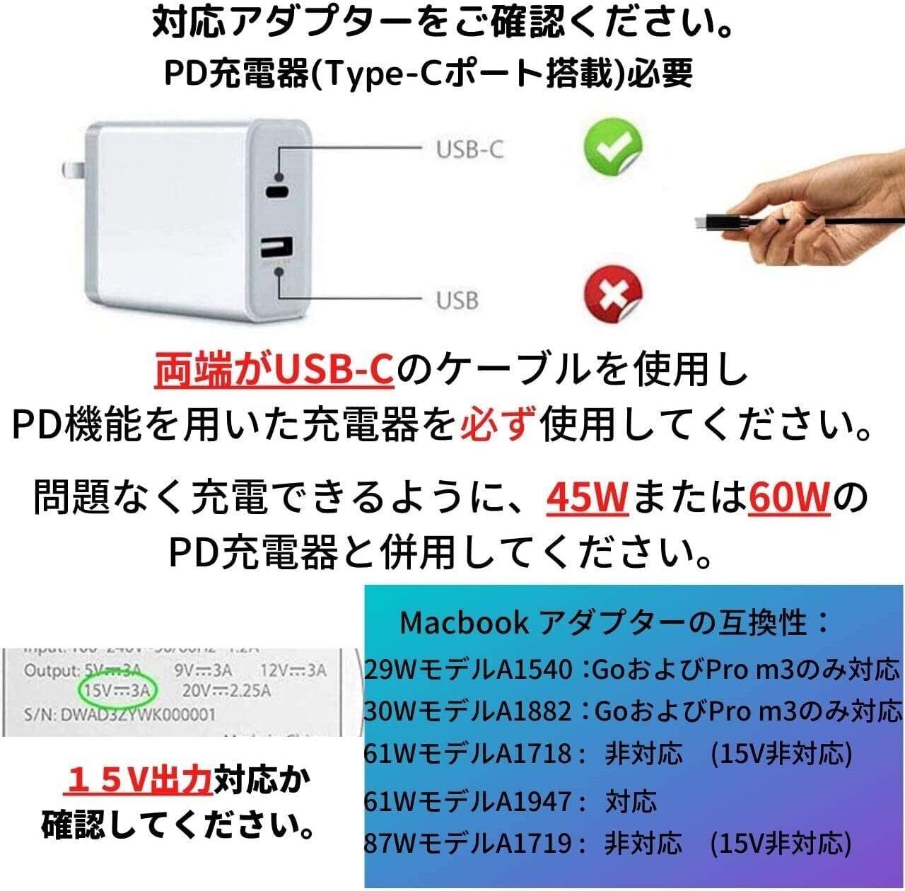 USBタイプC充電器は15V3A、45W以上の給電能力が必要です。 充電器の能力を満たしていても相性により充電できないことがあります。(商品到着から30日以内の返品可能)