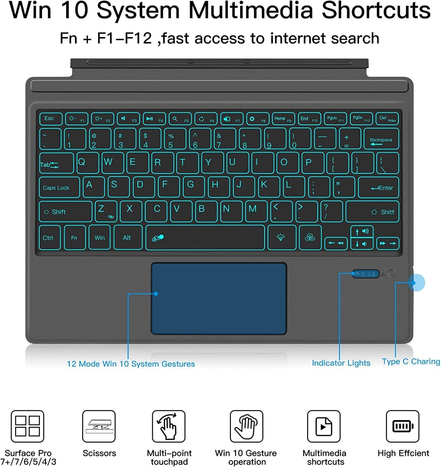 Surface Pro 7/Pro 7+/Pro 6 /Pro 5/ Pro 4/Pro 3 キーボード バックライト付き タッチパッド搭載 サーフェイス Pro 7 plus キーボード ケース 軽量 薄型 スマートワイヤレス Bluetooth キーボード 磁気吸着 surface pro7 pro6 pro5 pro4キーボード US英語配列, バックライト付き
