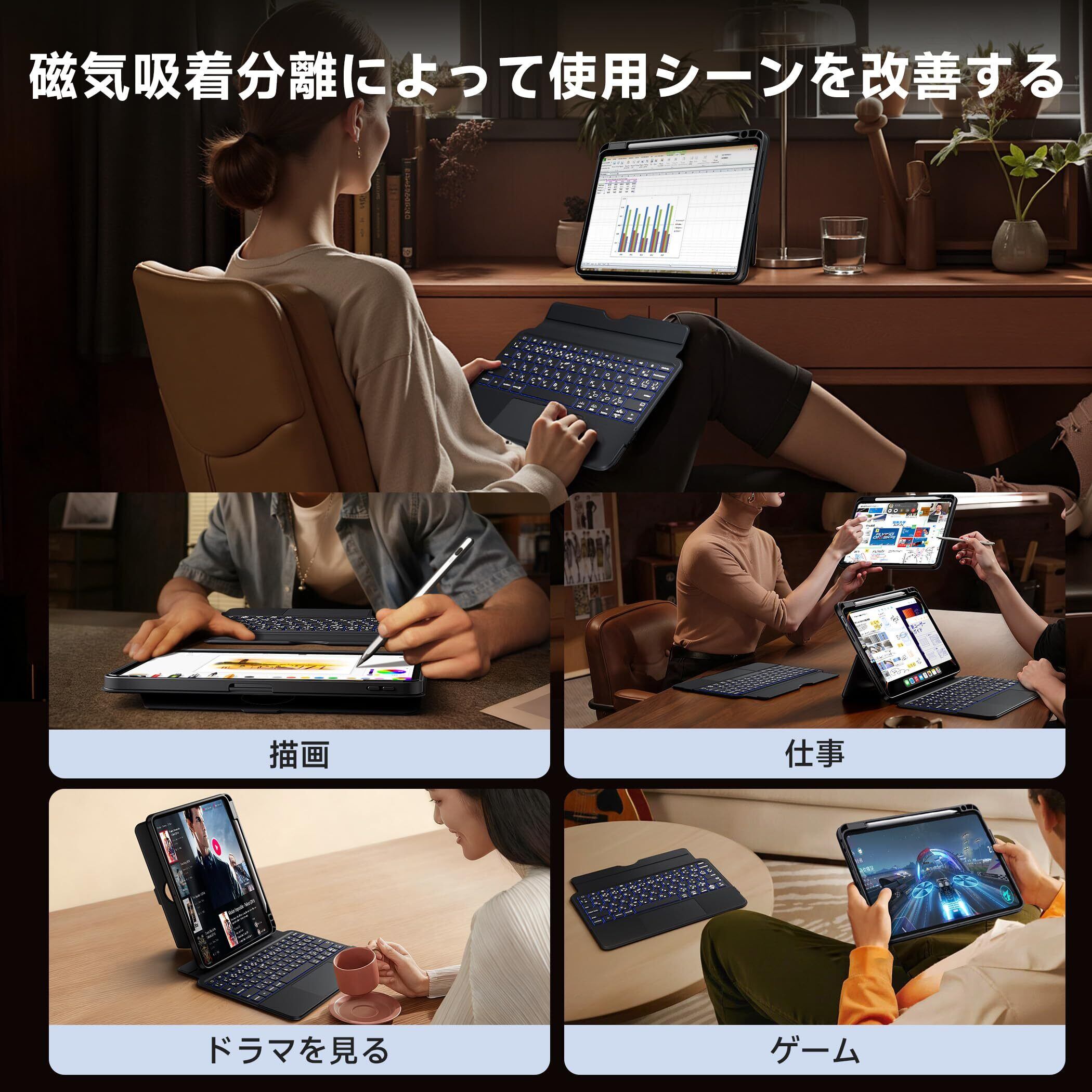 【分離式マグネット設計&強力吸着】 iPad キーボード付きケースは、キーボードとカバーが分離できるマグネット設計を採用。強力な磁力でしっかり固定し、持ち上げてもズレにくく、必要に応じてキーボードを取り外してタブレット単体でも使用可能。作業・動画視聴・読書など、シーンに合わせて自由に切り替えできます。