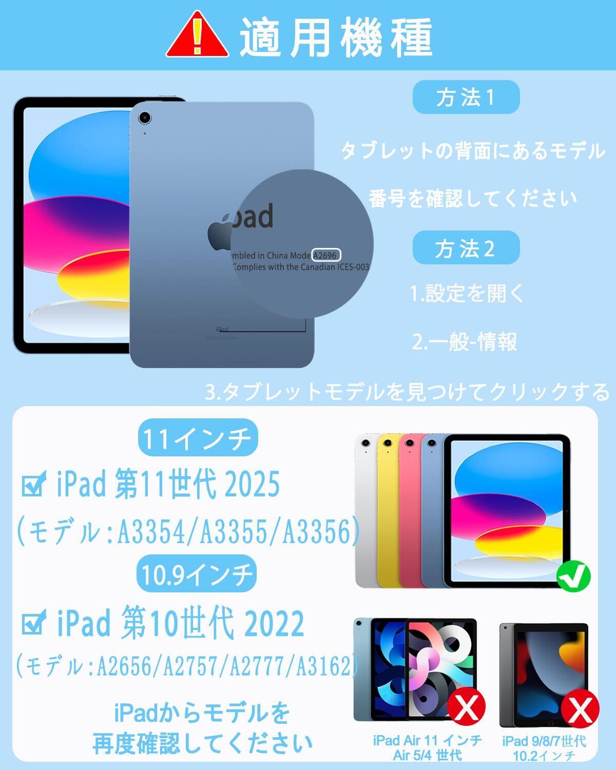 【対応機種】このキーボードケースは、iPad第11世代(モデル番号:A3355/A3356)、iPad第10世代(モデル番号:A2696/A2757/A2777)にのみ対応しています。ご購入前に、iPadの背面にある「AXXXX」で始まるモデル番号をご確認ください。(この製品にはタブレット、鉛筆は含まれていません!)