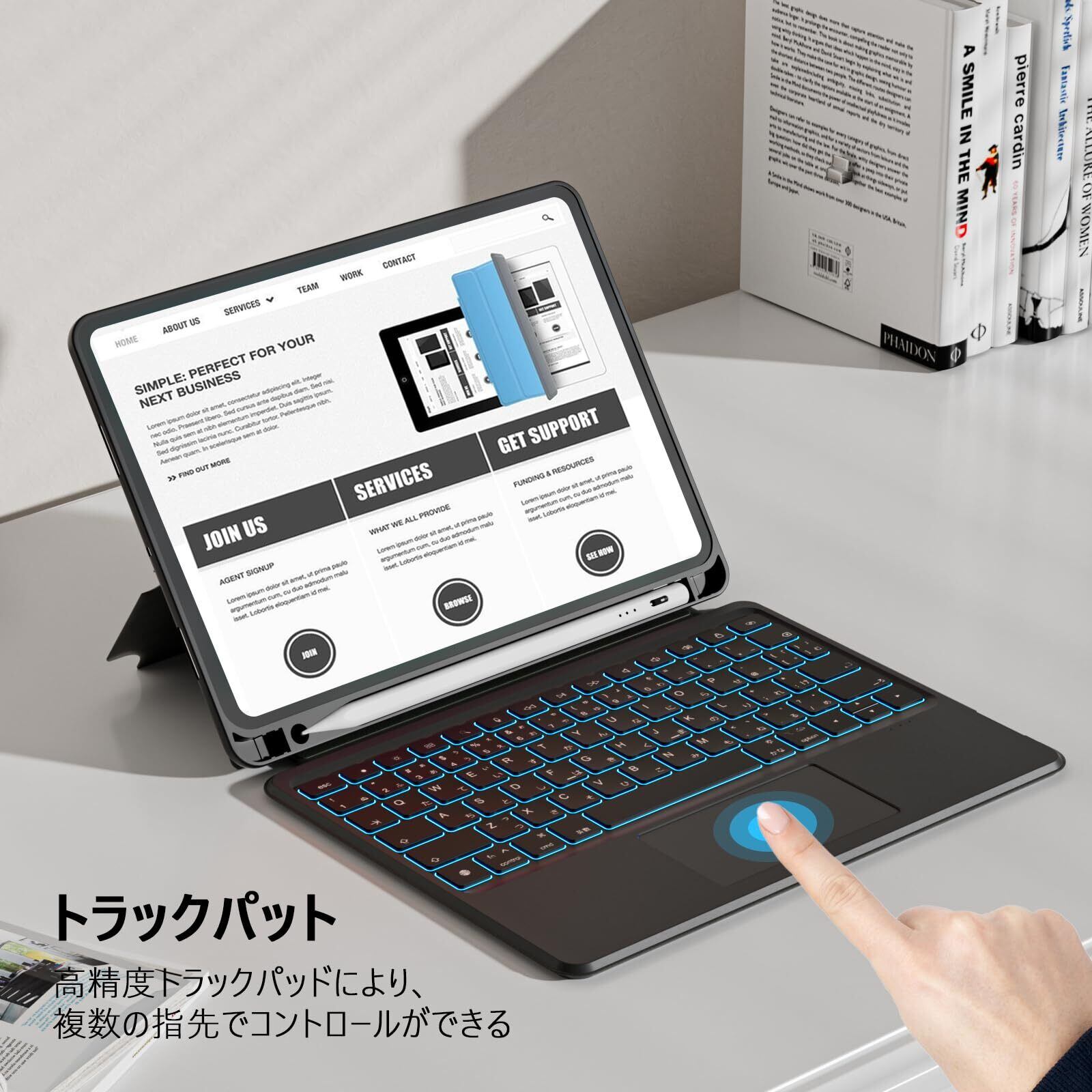 【高精度トラックパット】高精度で感度の高いAgガラス材質で作られ、感触が滑らかで、タッチが敏感で、iPadをすばやく簡単に操作することができます。高精度トラックパッドを使用して、複数の指先でコントロールができます。パンタグラフ式キーを搭載。独特な軽快なタイピング感を実現、静かで反応の良いタイピングができます。ファンクションキーを搭載していますので、一つのキーで入力方法の切替や検索などを操作でき、作業効率が大幅に向上します。