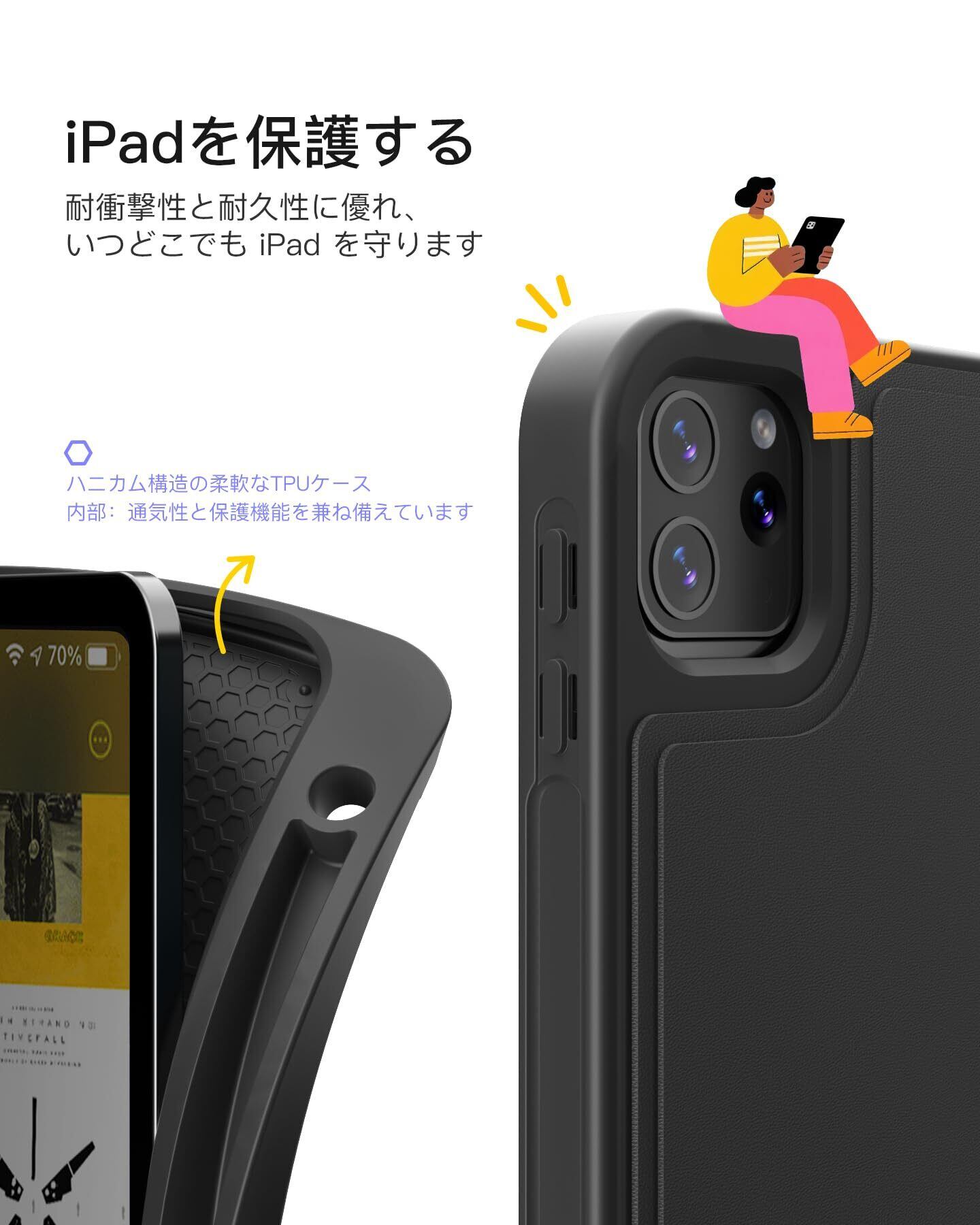 調整可能な視野角:3段階のスタンドとペンホルダーを装備したこのiPad Air 11インチ用キーボードケースは、視野角をカスタマイズして最適な快適さを実現できます。3つの溝が付いた補強ベースにより安定性が向上し、仕事、勉強、エンターテイメントに最適です。