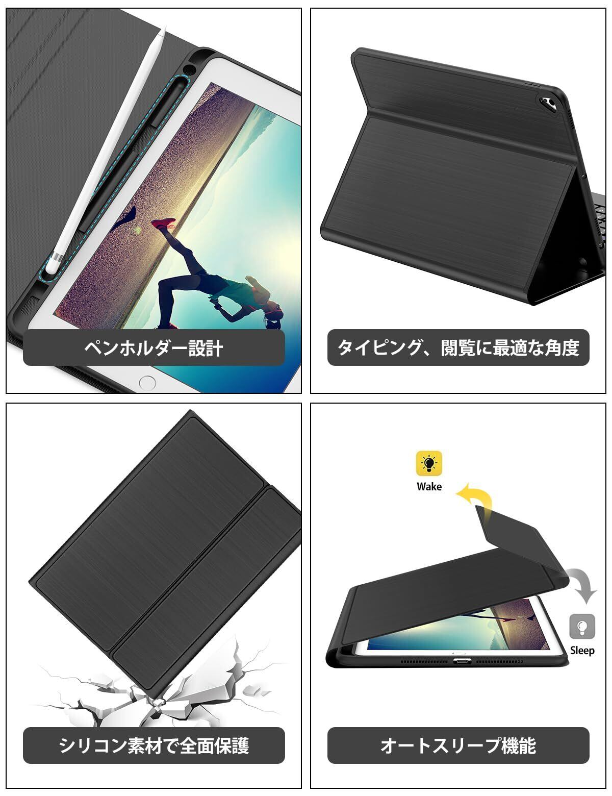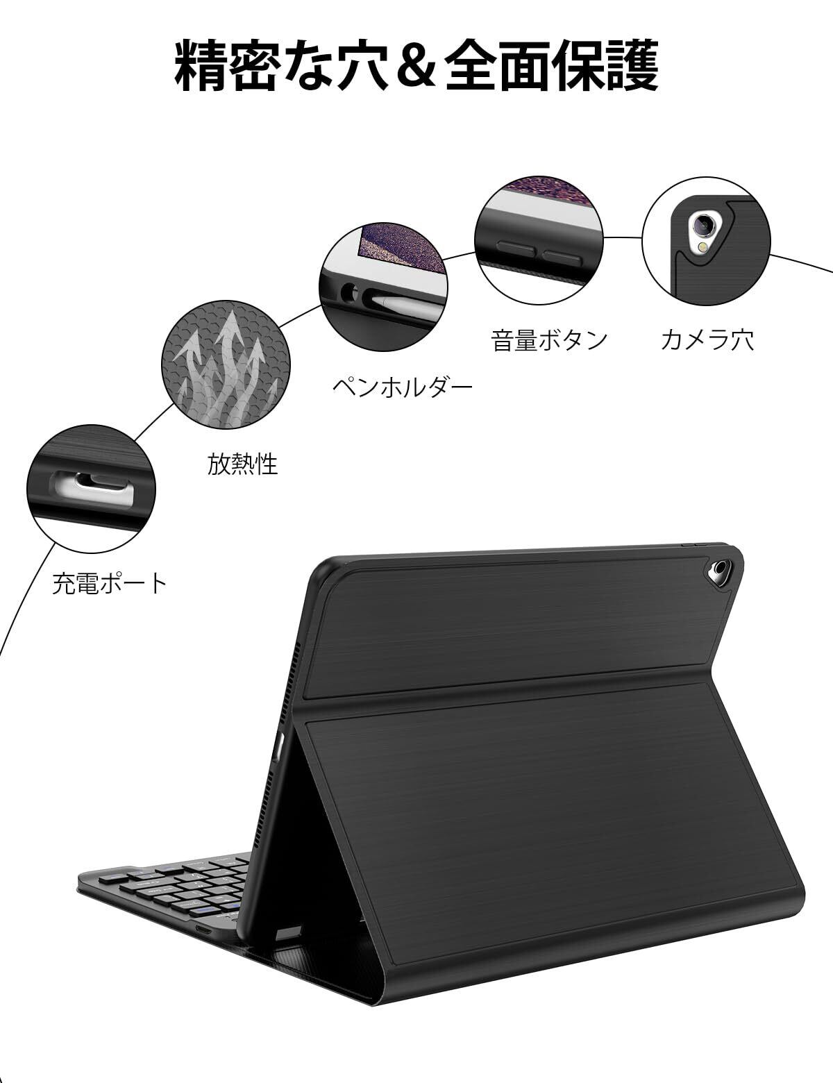 iPad 第9世代 キーボードケース iPad 第8世代 第7世代 キーボード (10.2インチ) iPad Pro 10.5インチ iPad Air 第3世代に適用 Bluetooth ワイヤレス キーボードカバー 脱着式 オートスリープ機能 多角度調整 傷つけ防止 ブラック