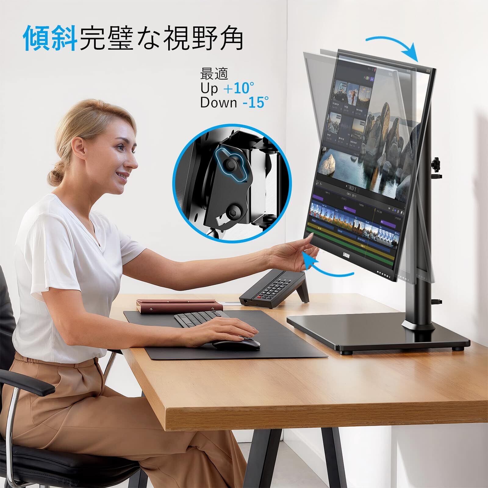 【ヒンジと高さ調整】スタンドの傾斜を+15°〜−15°、90°回転、360°回転、およびセンターロッドに沿った高さ調整を調整できます。ディスプレイは縦方向または横方向に配置することができ、ケーブル管理は変換中に電線の整然とした秩序を維持することができる