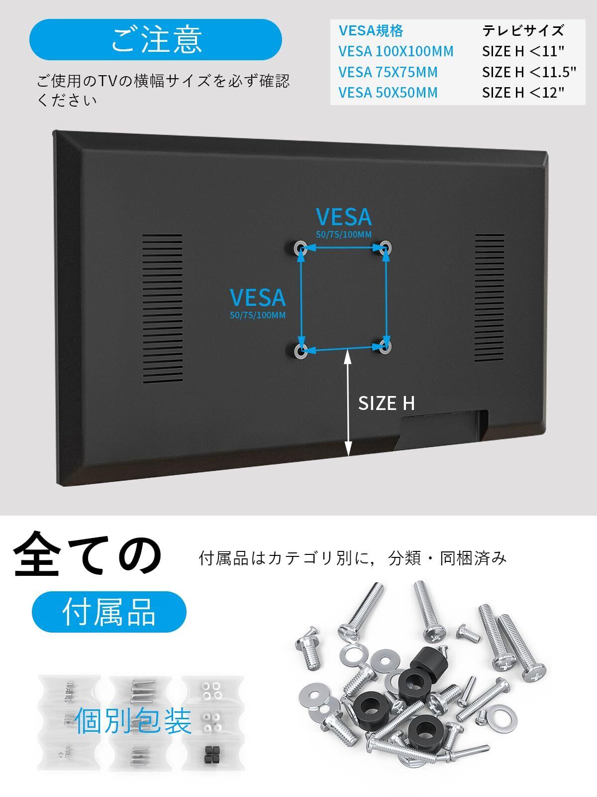 【画面互換性】このスタンドの画面最大荷重は35 kgで、VESAサイズが50 x 50 mm/75 x 75 mm/100 x 100 mmの背面取付穴が付いています。市販の13~32インチモニタ
