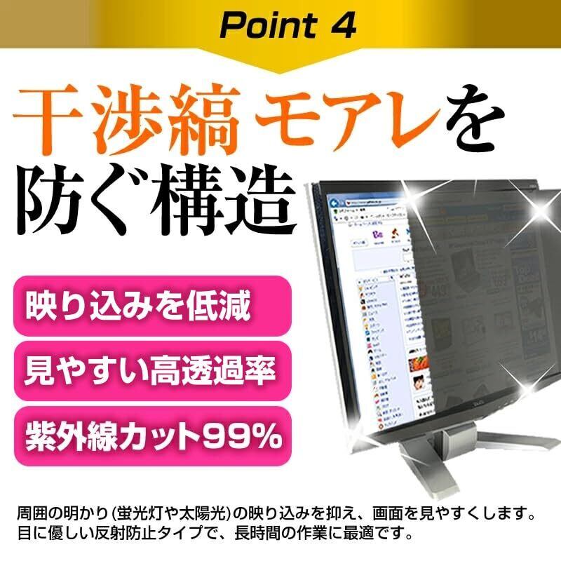 ・表面は硬度3Hのハードコート仕様で、キズや汚れから液晶画面を保護します。・静電気防止加工により、ホコリの付着を抑え、清潔な使用環境を維持。・透過率70% ±5%の高品質フィルターで、正面からの表示は文字もくっきり鮮明。・ブルーライトを約45%カットし、目への負担を軽減。・紫外線も99%カットし、液晶画面の劣化防止にも効果的です。・フィルムの厚みは約0.4mmです。・干渉膜モアレを防ぐ特殊構造で、快適な視認性を実現します。