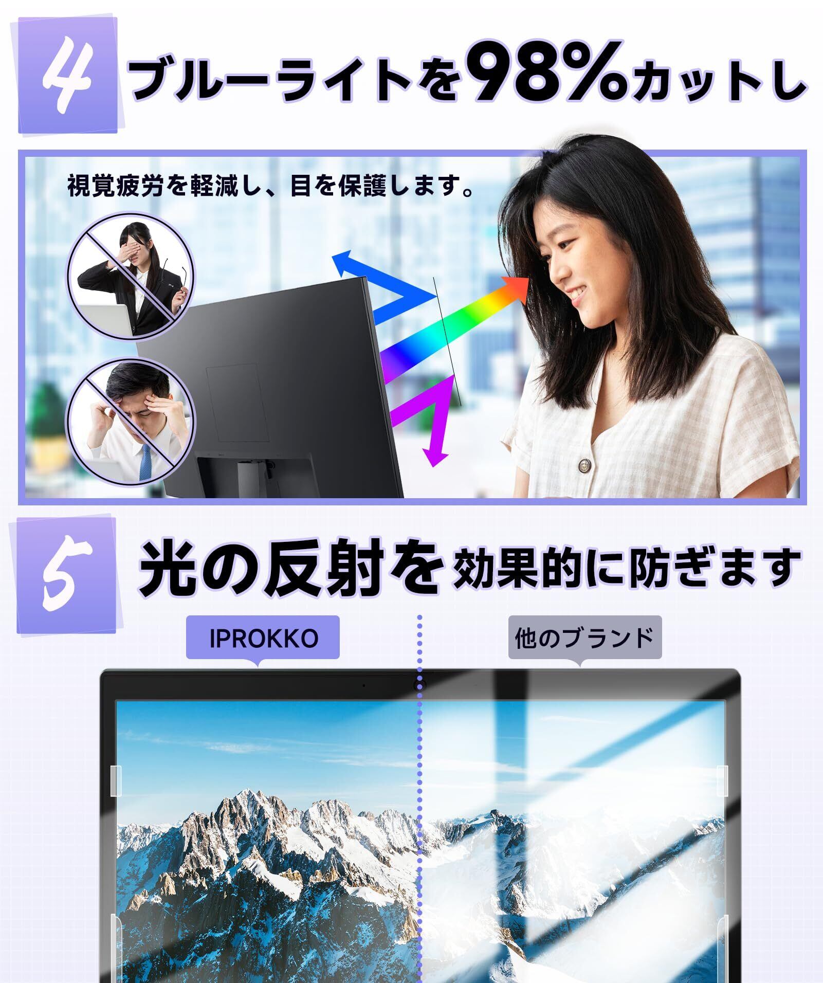 【目の保護】パソコンのぞき見防止保護フィルムは日本から輸入された高品質の素材と独自の技術を使用しており、紫外線を最大92%、ブルーライトを95%カットします。画面上のデータを保護するだけでなく、目の疲れも防ぐスクリーンプロテクターです。眼圧を下げ、目の筋肉をリラックスさせるのに役立ちます