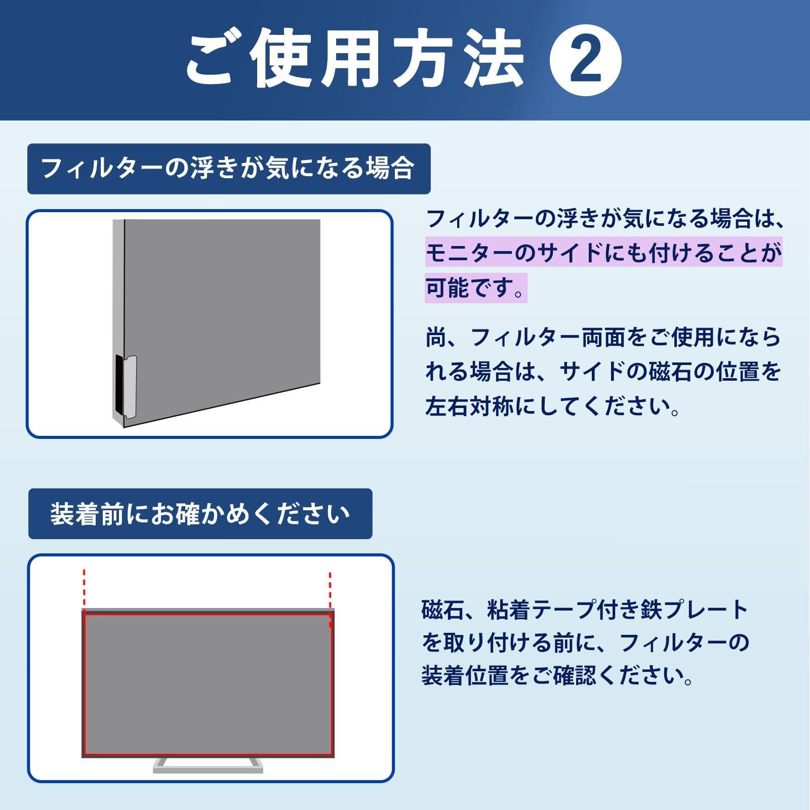 【ご使用方法】1. 粘着テープ付き鉄プレートから粘着テープの保護シートを剥がし、フィルターの上端(左右2ヶ所)に貼り付けます。2. フィルターをモニターの画面に合わせ、磁石の装着位置を確認してください。3. 磁石の保護シートを剥がして、モニター上部の両端に貼り付けます。4. フィルターに貼り付けた鉄パーツをモニター上部に合わせて装着してください。