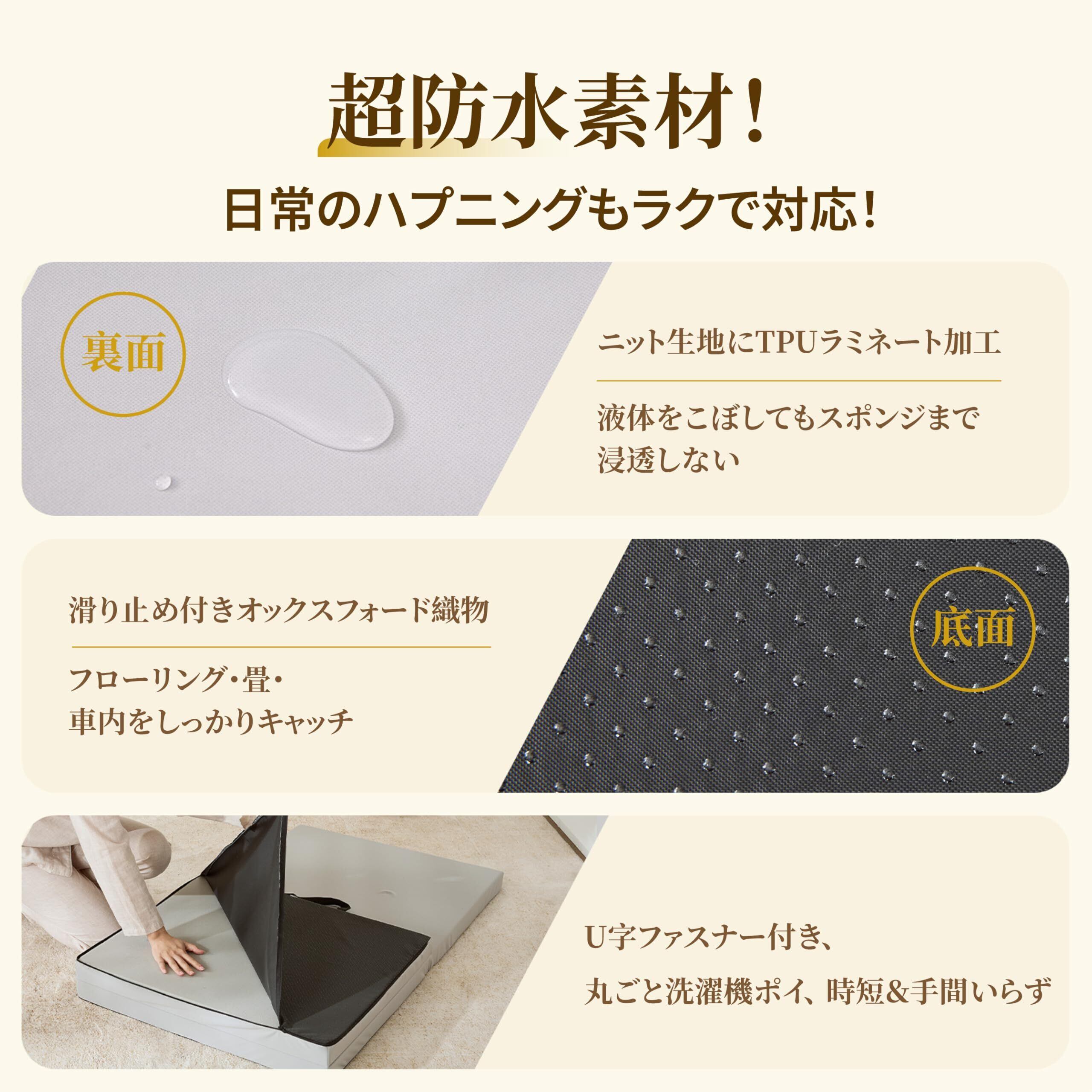 【清潔をキープ】防水&洗えるカバーで、アウトドアでも室内でも思いっきり使える。 表面はTPU、底面は滑り止め加工のオックスフォード生地を採用した防水カバー。砂浜や土の上でも安心です。万が一の汚れも、カバーは丸洗いOKで、清潔さを保てます。内材に練り込まれた天然竹炭パウダーが、湿気や汗の嫌な臭いを吸着・分解。蒸し暑い季節の車中泊でも、さわやかな朝を迎えられます。
